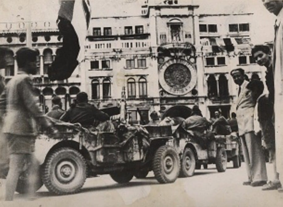 After battling fascism in North Africa and all the way up the boot of Italy, the unit’s final flourish was to land their Jeeps from lighters drawn up on Venice’s Grand Canal, and to drive them jubilantly around the famous square. They were remarkably silent in 2005, lost, I imagined, in their recollections. The black and white photos of that far-off day depict amused Italian civilians watching the British soldiers, and children running excitedly behind the Jeeps.
