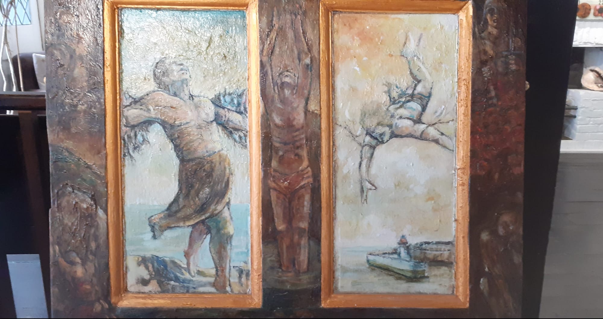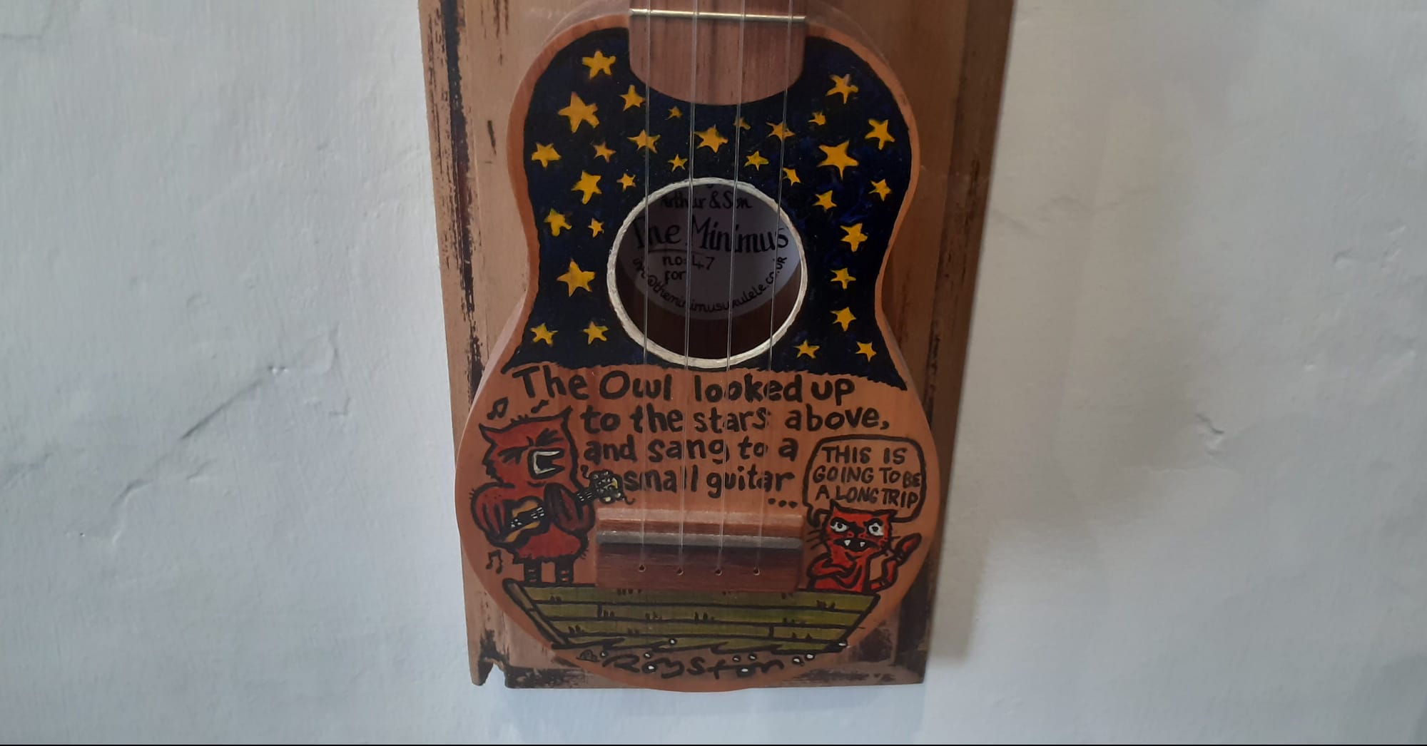 He invited several artists, including Dave Winthrope, Abbi Roberts, Pete Buckley, Anna Allcock and others, including David Ridgway. His idea was for the individuals to paint the ukuleles or to bolt a construction on the neck of the ukulele, the height of which is 260mm. He uses English made Living Water flurocarbon soprano strings and salvaged ebony piano keys for the top nuts and saddles and presently he is using sustainable spruce for the soundboard. He also uses reclaimed hardwood where possible. Most fascinating are the paintings and constructions on the instruments from the individual artists.