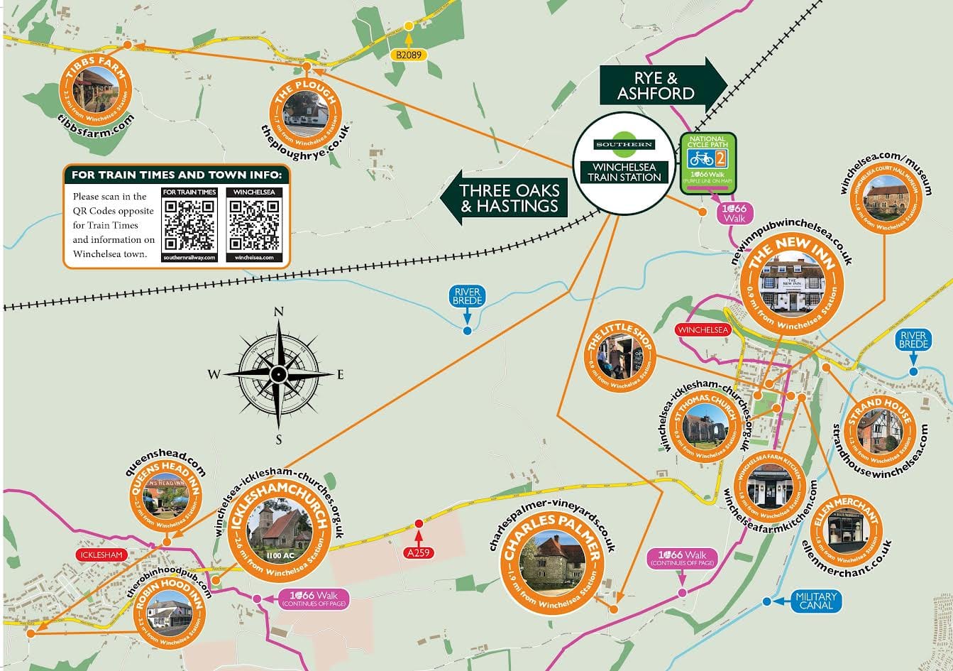 An updated map and leaflet has been launched to promote businesses and attractions within walking and cycling distance of Winchelsea railway station. The brochure shows pubs, vineyards, shops and guest houses which are between 0.9 and 3.2 miles from the station.