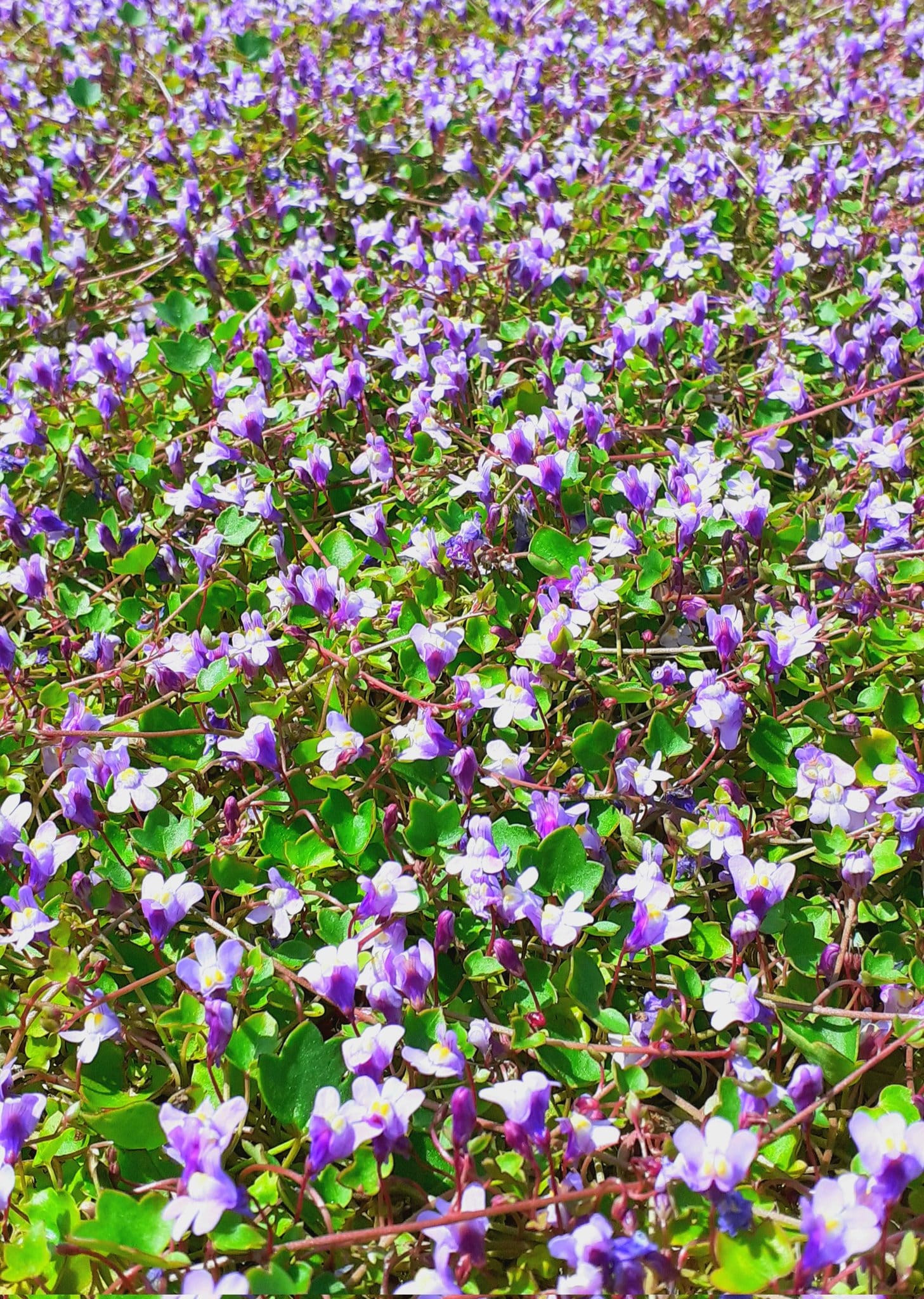 The lovely Ivy-leaved Toadflax can form extensive, creeping patches and its jolly mauve flowers look like little snapdragons.