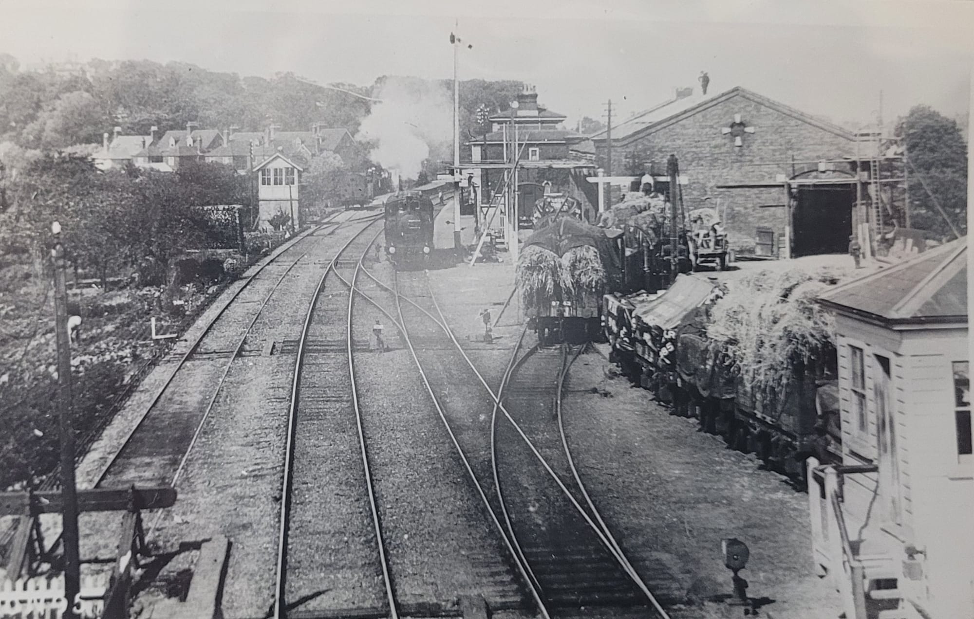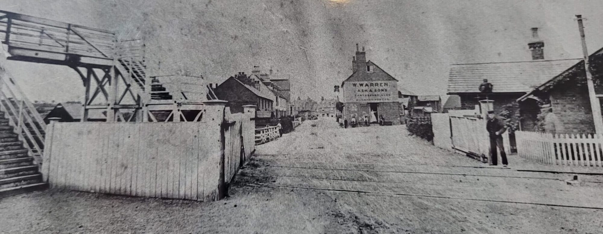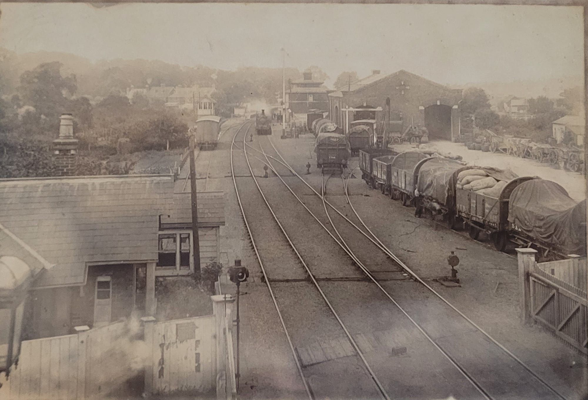 View from the footbridge looking across the station and the railway sidings in the 1890s. There was a coal stage built in 1854 and railway sidings were added in 1874. The sidings included a turntable for trains to Rye Harbour and for the delivery of stock. The cattle and sheep market was situated beside the railway.