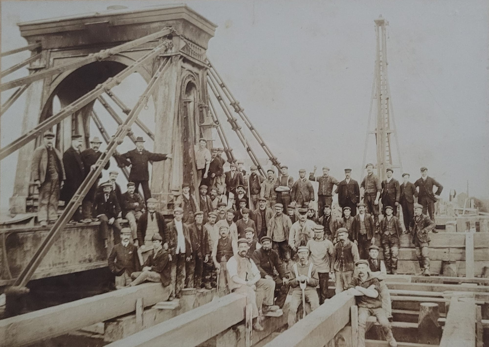 This picture shows the team who were building the new bridge for two rail tracks, before dismantling the old swing bridge over the river Rother, Rye. The new rail bridge was opened in 1903.