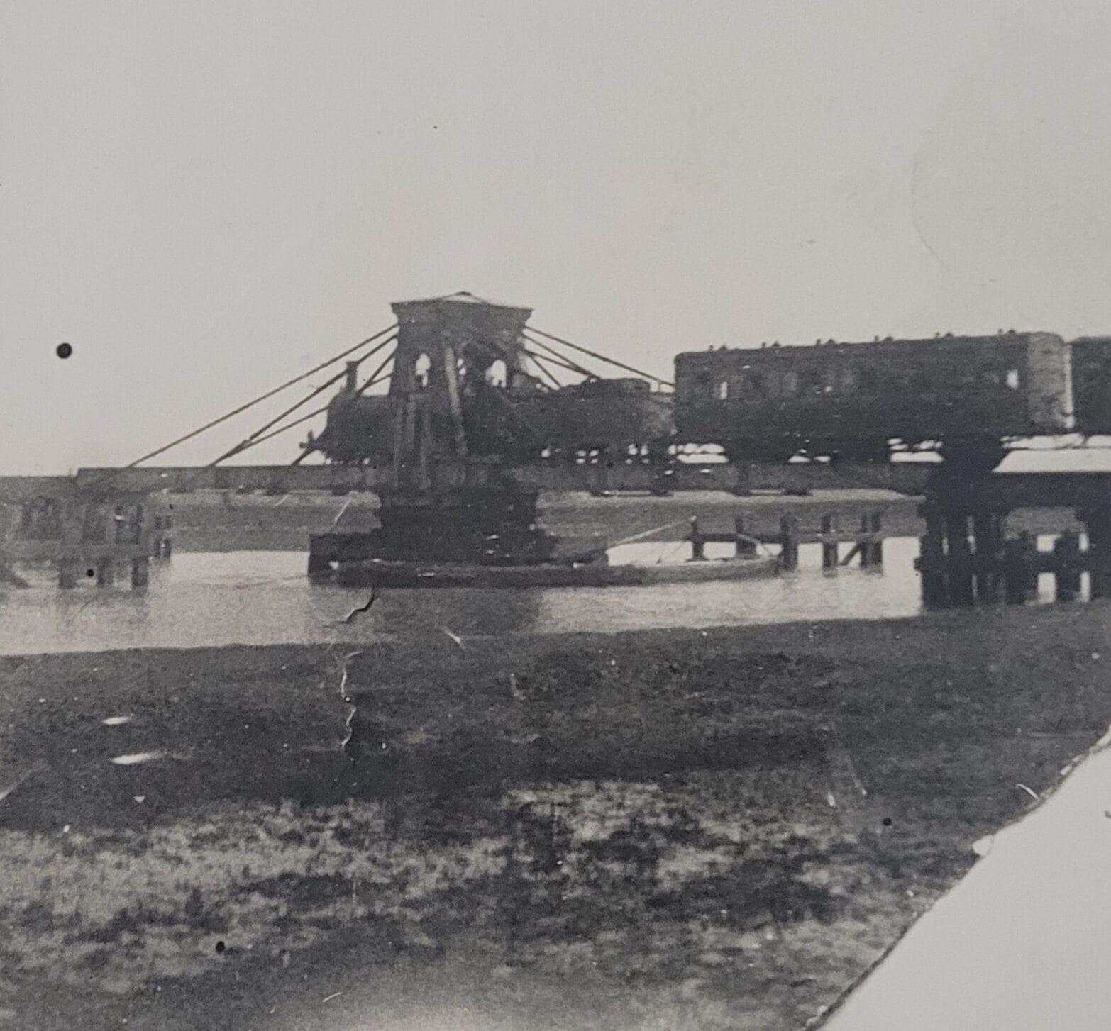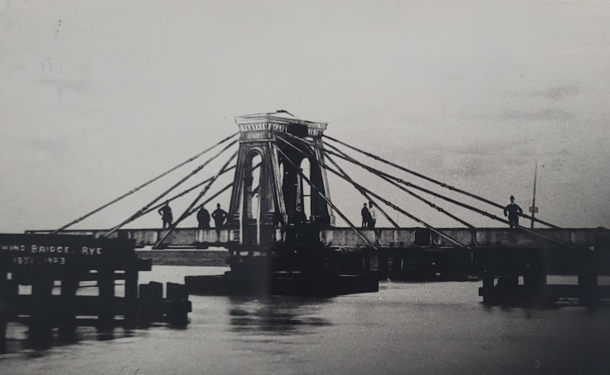 The swing bridge was built in 1851 to enable fixed masted boats to pass along the river. Two men could easily open it in around two and half minutes. This print of 1851 shows the bridge over the Rother with an early engine crossing the single track.