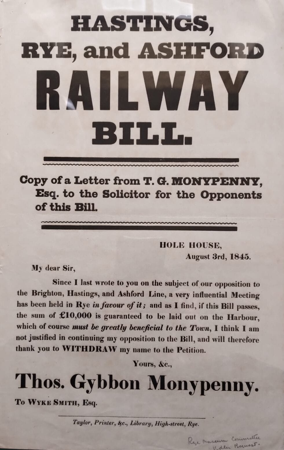 The London to Ashford South Eastern line was completed in 1843 with plans to extend it to Hastings via Rye. However work did not start on the extension until 1846 due to a dispute between the London and Brighton Railway and South Eastern Rail about who was to build it. At the same time the Harbour Commission was concerned about building a swing bridge over the river Rother. In order to placate opposition it was agreed that a railway bridge at Landgate would be built over the line and the huge sum of £10,000 (equivalent to £1,154,000 in 2023) was given to the Harbour Commission for harbour works. The estimated cost of the railway was set at £250,000 (equivalent to £29 million in 2023).