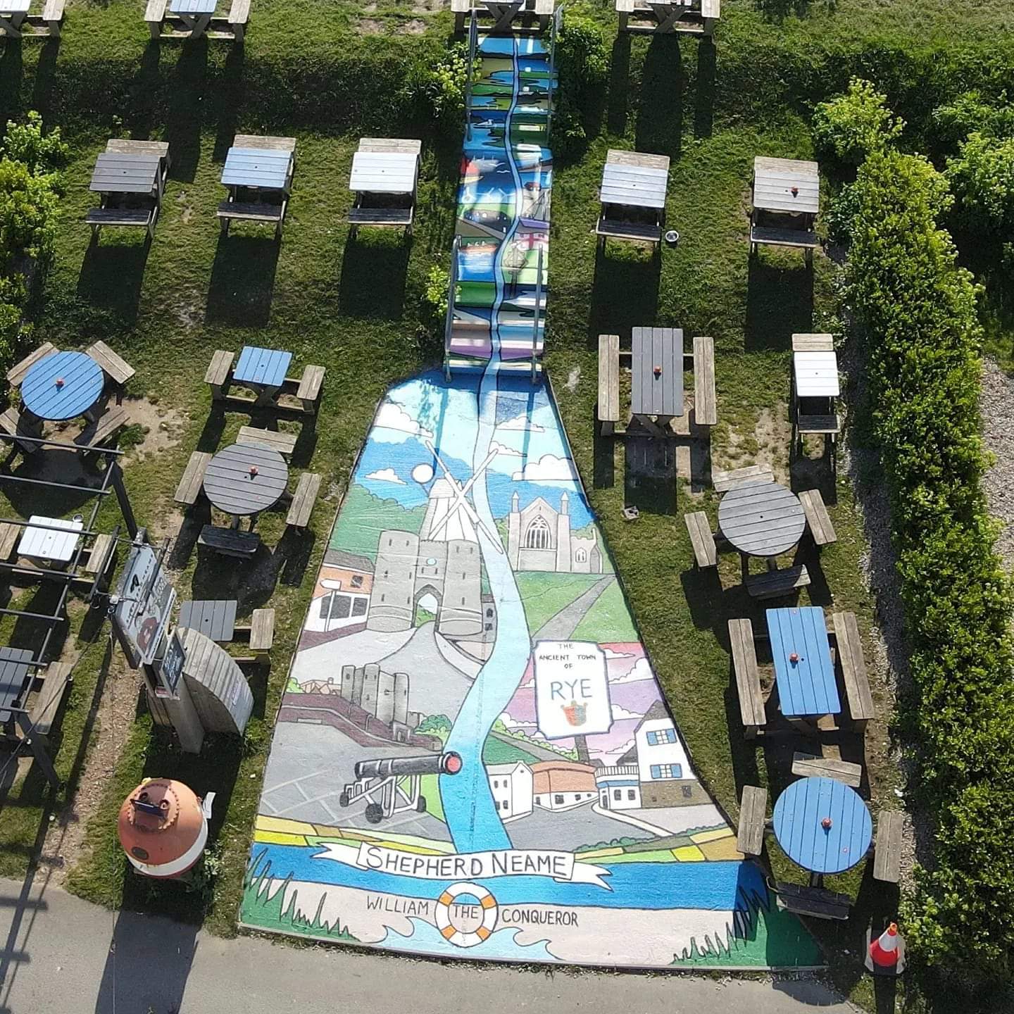 The bright and colourful painting covers the steps and path that runs through the tables in front of the pub and depicts the river Rother as it snakes across the marsh and past various local landmarks including the red roofed hut, the windmills, the RNLI flag, the Landgate, Ypres Castle and the Gun Garden, and St Mary's Church.