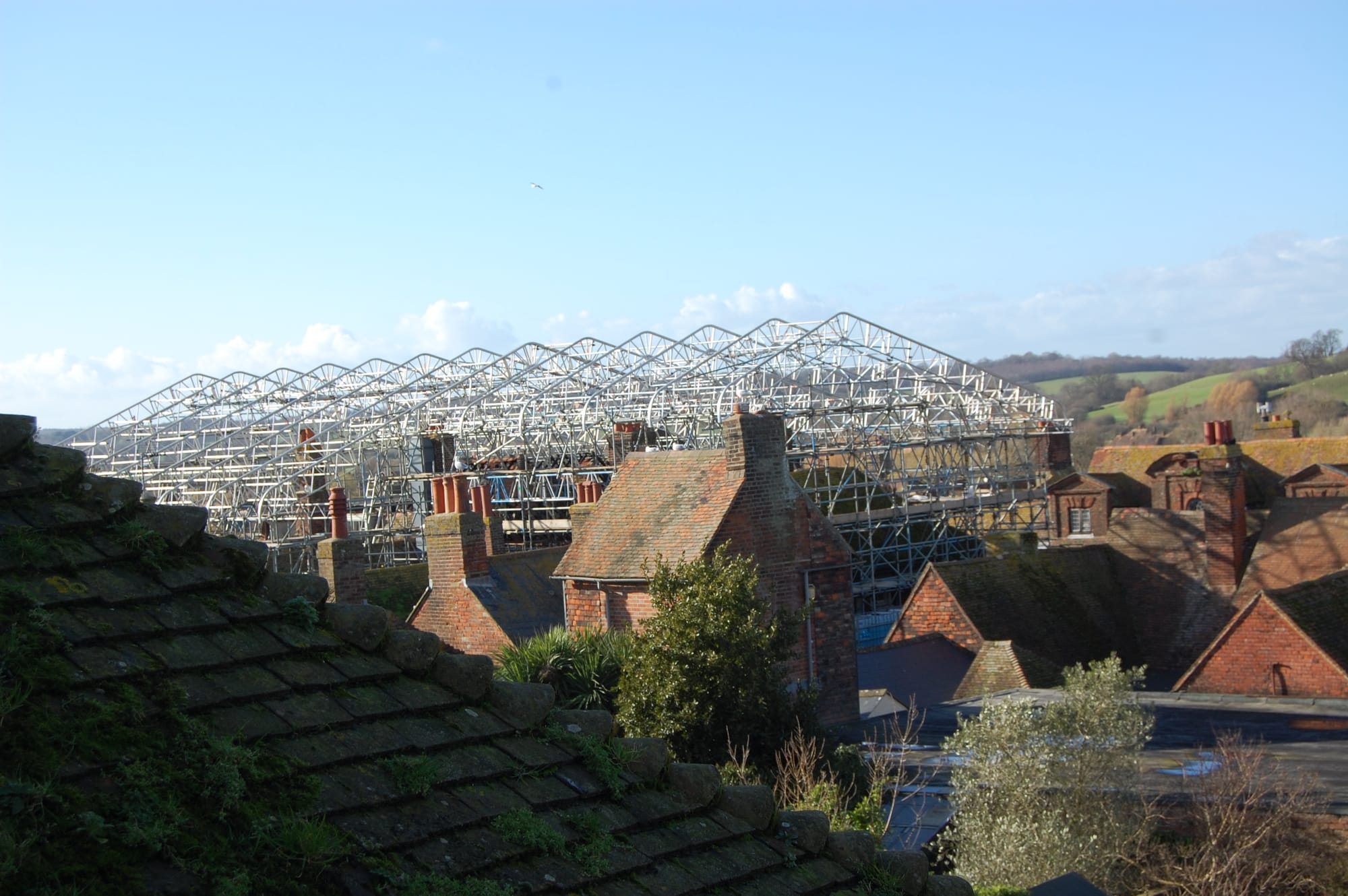 And that overlapping roof framework (which, no doubt, will be covered over shortly) requires support on the street side of the walls from the scaffolding. Indeed the temporary roof framework can now be seen from some distance away down by the station towering over the rooftops.