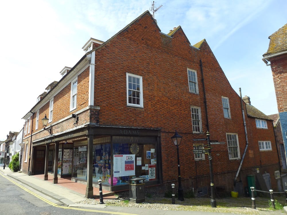 The large building now occupied by Adams was sold as a building site in 1736 when the present structure was developed including brick barrel vaulted wine cellars beneath. It started life as four houses, one of which survives at the far end and was taken over by an early mail order pioneer, John Neve Masters, a watchmaker in the Victorian period. It is one of several buildings in Rye clad in mathematical tiles, shaped clay tiles nailed to timber framing and pointed between to simulate brickwork.