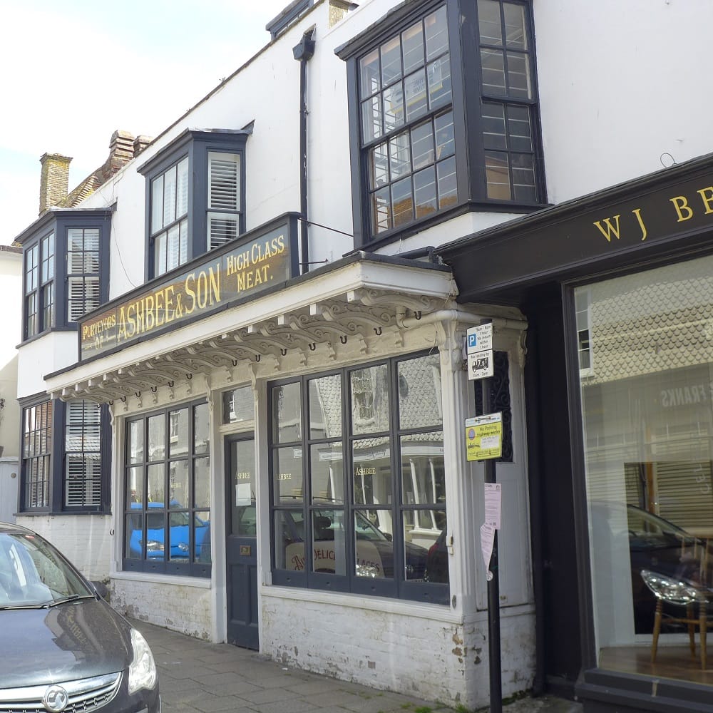 Another of the three antique glass fronted fascia signs survives at 100 High Street together with the canopy from which Ashbee & Sons Meat was hung. The butcher’s business had a shop in East Street next to Rye Museum and moved to this site about 1900 taking over an established business