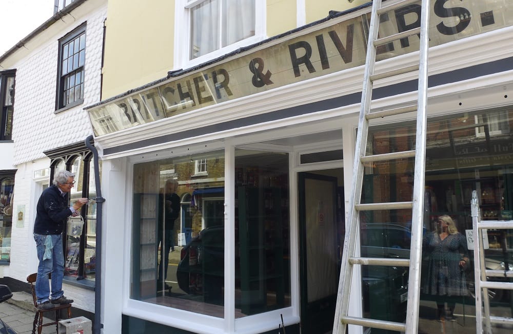 Among other shop owners taking the opportunity of the lockdown to carry out painting is ‘Sweet Shop Tony’ of Britcher & Rivers who discovered this antique glazed fascia sign (one of three surviving in the High street) when opening his confectioner’s shop several years ago. The sign dates from 1919 when a men’s outfitters, later known as Rivers, was opened.