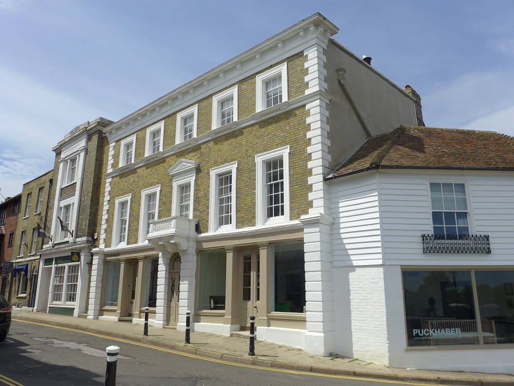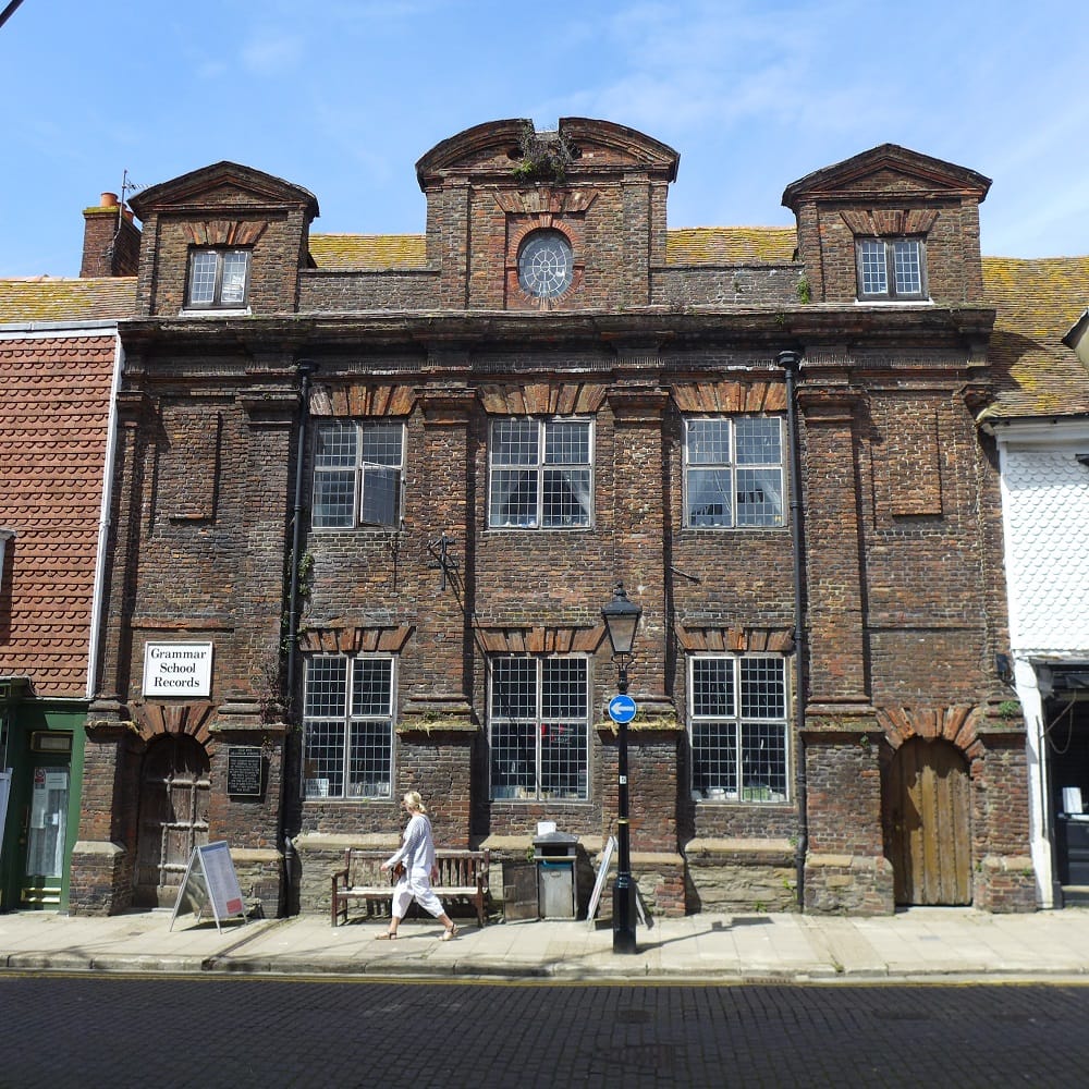 In a prominent position opposite Lion Street looking up to the church tower is Grammar School Records. This very fine early decorative brick façade was built in 1736 by Thomas Peacock, a Rye councillor who established it as the town’s grammar school. It was in use until the present Rye College site was developed in 1908 and was converted from meeting rooms to the present shop and flats over in the 1980s (featured photograph)