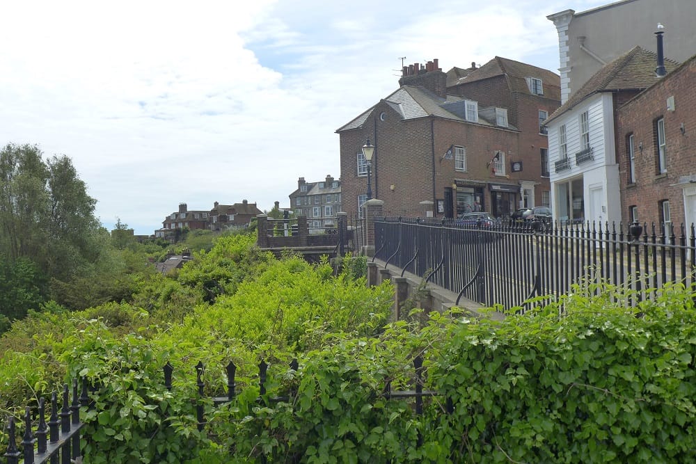 On your left, the steep slope down to Fishmarket Road was planted and divided off from the start of the high Street known as Hilders Cliff by municipal railings and a retaining wall from 1867. The two lookouts were later additions; the closer from 1914 in memory of John Symonds Vidler, a local ship owner much involved in affairs in the town, and the further from 1935 in honour of E F Benson, the author of “The Mapp and Lucia” novels who lived at Lamb House. In the background, the tall buildings are Seaview Terrace, a development from the 1880s built on the edge of the cliff off East Street. The green area stretching to the Ypres Tower was once the site of streets of houses known as “The Baddings Ward” lost to landslip into the sea in the 14th century