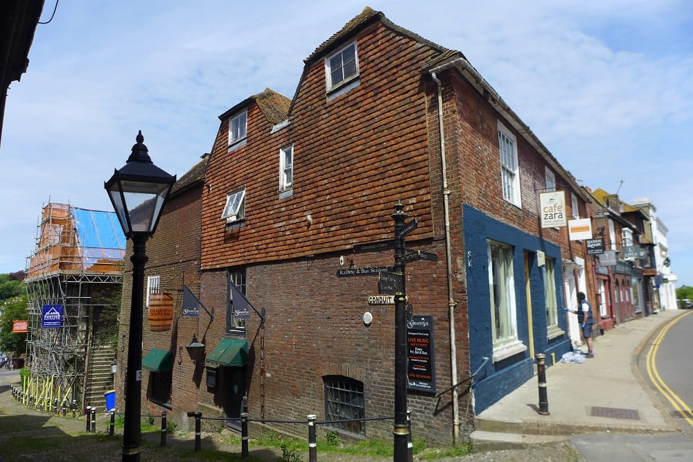 Looking back from the top of the Conduit Hill research by David and Barbara Martin has shown that this whole block of the town was part of the Monastery, the Augustinian Friary (covered in scaffolding on the left), which moved to this site in 1378 following the landslip. The monastery owned the street frontage and developed it with shops, originally about three metres further back. One building has kept its medieval timber framed front wall fossilised behind. In the foreground, Café Zara occupies the former Custom House, a Georgian building which was later the home of Adams of Rye, Printers who later moved across the road to its present building