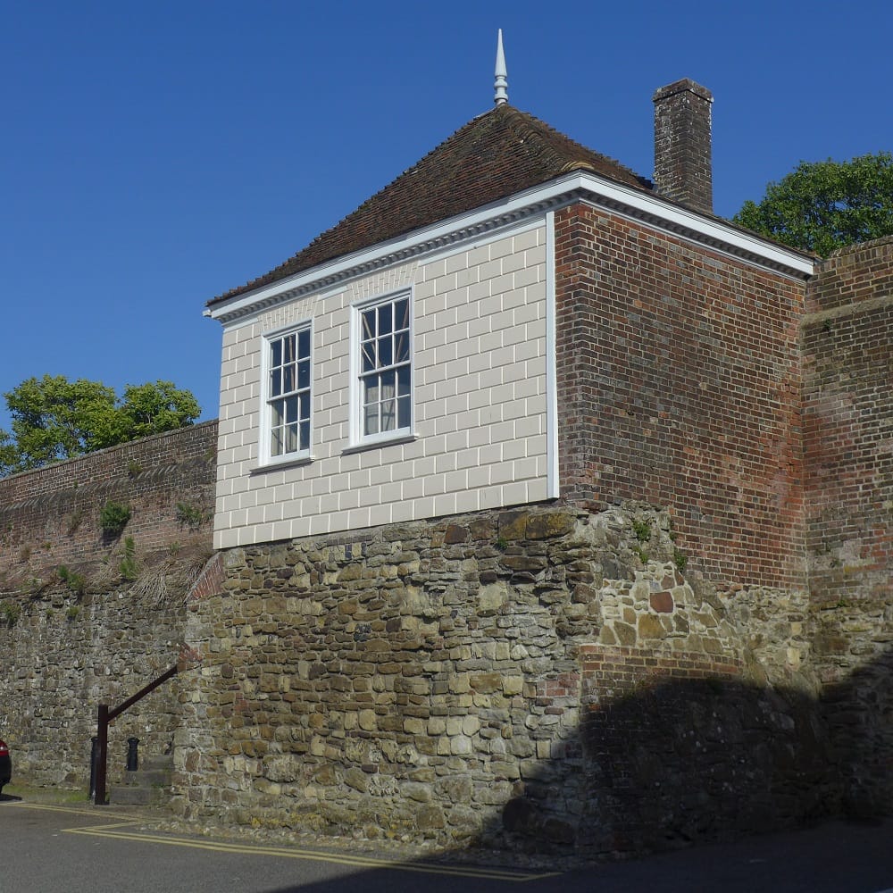 Starting in Cinque Ports Street, the structure adjoining the medieval town wall (shown above left) in the car park is a gazebo, an 18th century summerhouse used for leisure and entertaining by owners of larger houses with gardens. This example is clad in “ashlar” boarding resembling dressed stone. It was part of the large garden of 11 High Street. Another example in the town is the five storey gazebo at Little Orchard House and there were other structures on the cliff edge at Watchbell Street.