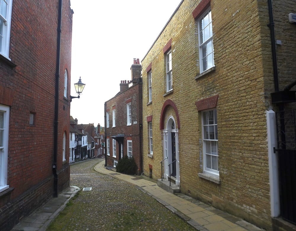Further on, two adjoining brick houses represent the beginning and end of the Georgian era in new building in the town. Norman House is the later, with fashionable yellow bricks of c1790, Tower House beyond is the earlier, having an early 18th century carved bracketed canopy over the front door. Both were occupied by doctors in the 1850s. To the left can be seen medieval and 16th century houses typical of Rye extending down to the High Street.