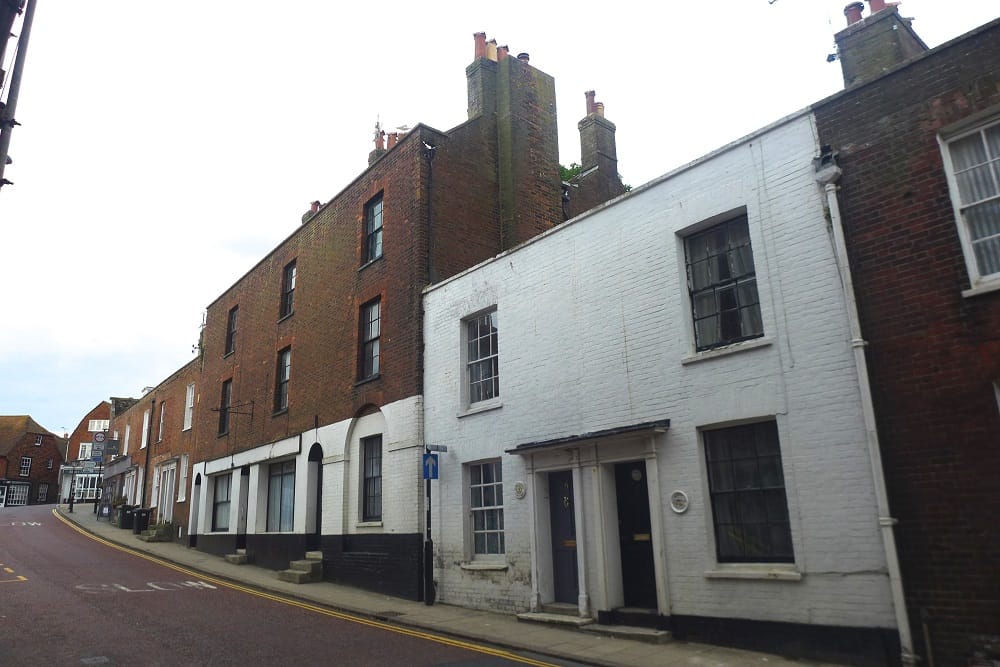 Moving on eastwards into Tower Street, is one of the earliest of Rye’s terraced housing developments dating from about 1830 built on the Town Ditch, the outer part of the town’s defences. It is not known whether it was the work of a builder or financed by business owners in the town. By 1859, the three tall houses were owned by Henry Harnden, a master mariner. Terraced housing continued to be built around the outskirts of the town throughout the remainder of the 19th century and Edwardian periods.