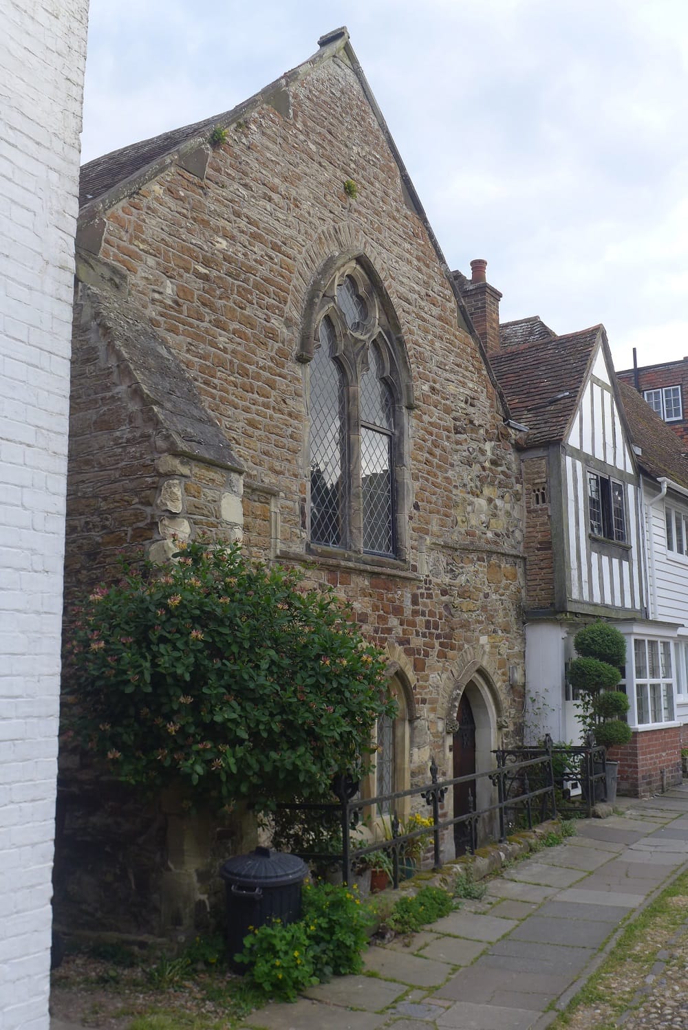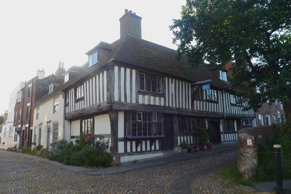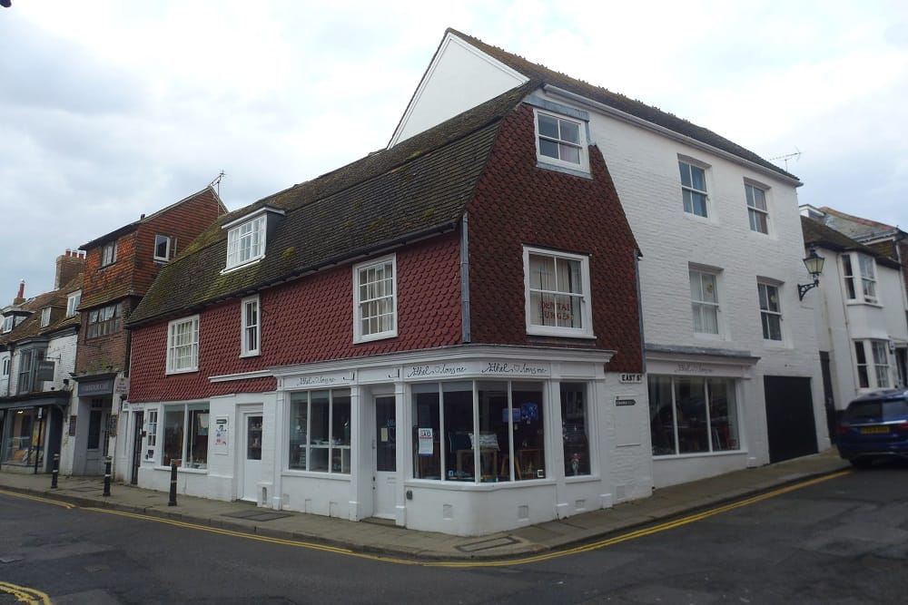 Turning down Mermaid Street, The Old Hospital on the right is a merchant’s house dated on the facade 1576, showing the high status close vertical studding and overhanging gables typical of the period just before the decline in Rye’s fortunes. It is understood that recent archaeological excavations in the rear garden have found the remains of an earlier stone-built town house from the 12th century. To complete the circuit, the route runs through Wish Ward to Cinque Ports Street.