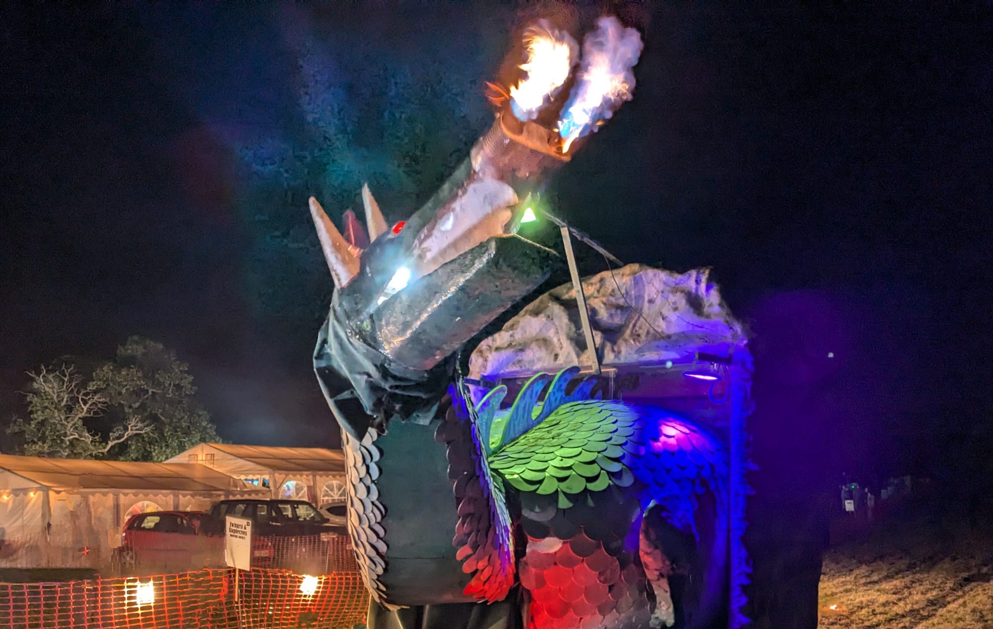 One of the highlights of the procession is the appearance of the impressive, fire-breathing green dragon, Scorcher, which is pulled around the town belching smoke and flames, delighting the crowd by leaning towards them as she passes. You can read about Scorcher's history here.