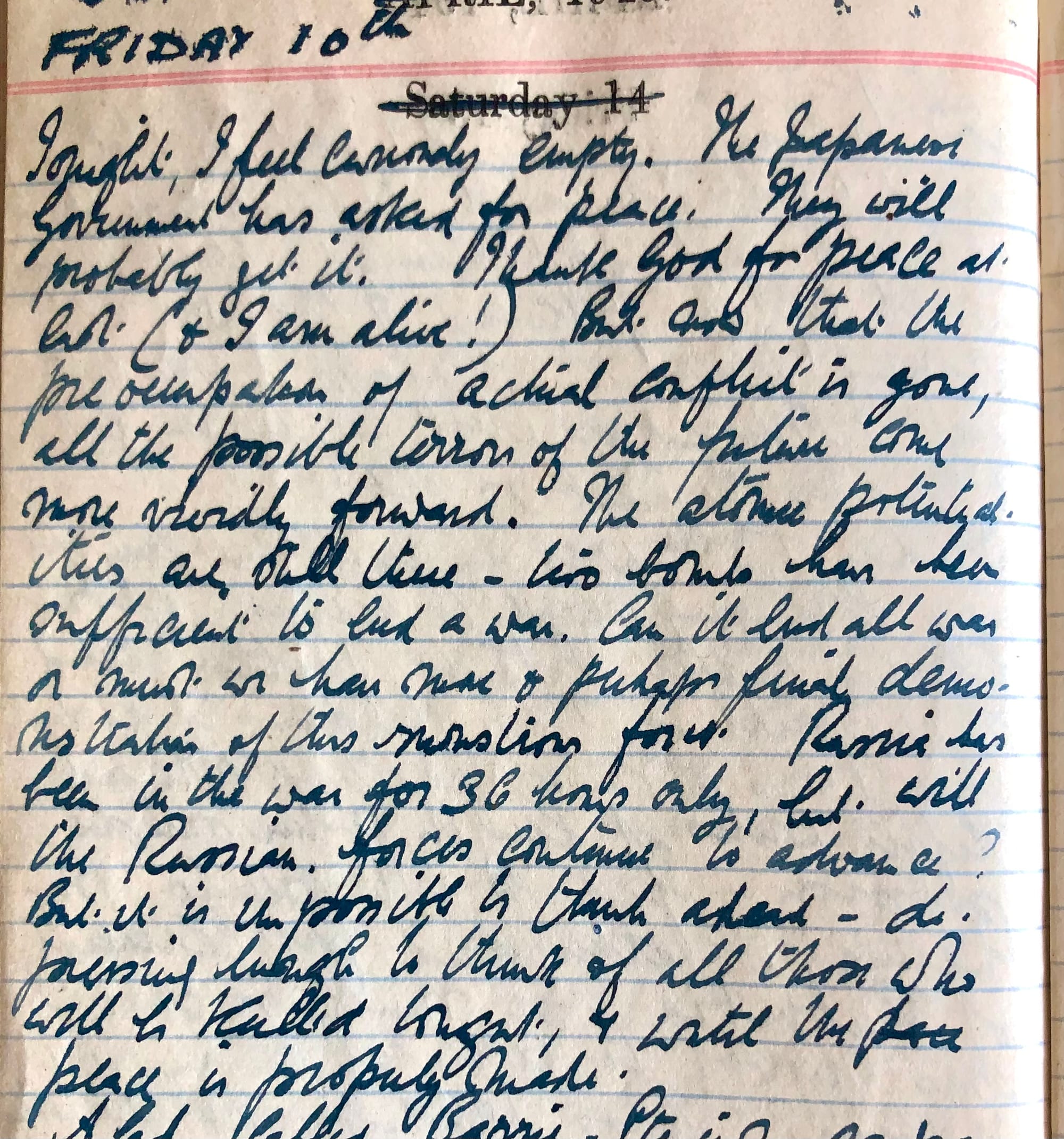 Along with her brother Christopher, she read an excerpt from the diary on August 10 1945 at the Rye VJ 80 service. "Tonight, I feel curiously empty. The Japanese government has asked for peace. They will probably get it. Thank god for peace at last (and I am alive!). But now that the preoccupation of actual conflict is gone, all the possible terrors of the future come more vividly forward. […]. Two bombs have been sufficient to end a war. Can it end all war or must we have more and perhaps final demonstration of this monstrous force. […]. But it is impossible to think ahead – depressing though to think of all those who will be killed tonight, and until peace is properly made.”
