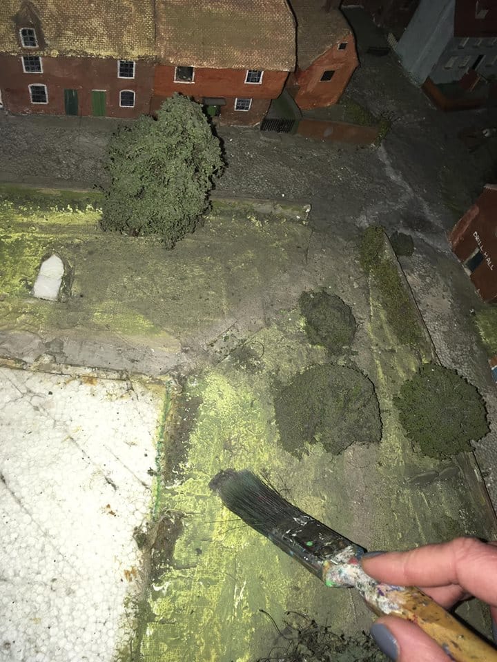 All foliage was removed from the model (first taking care to ‘zone’ each area so that the town could be appropriately re forested) washed gently in warm soapy water, dried, reshaped, sprayed with artist grade fixative and sprinkled with fresh lichen.