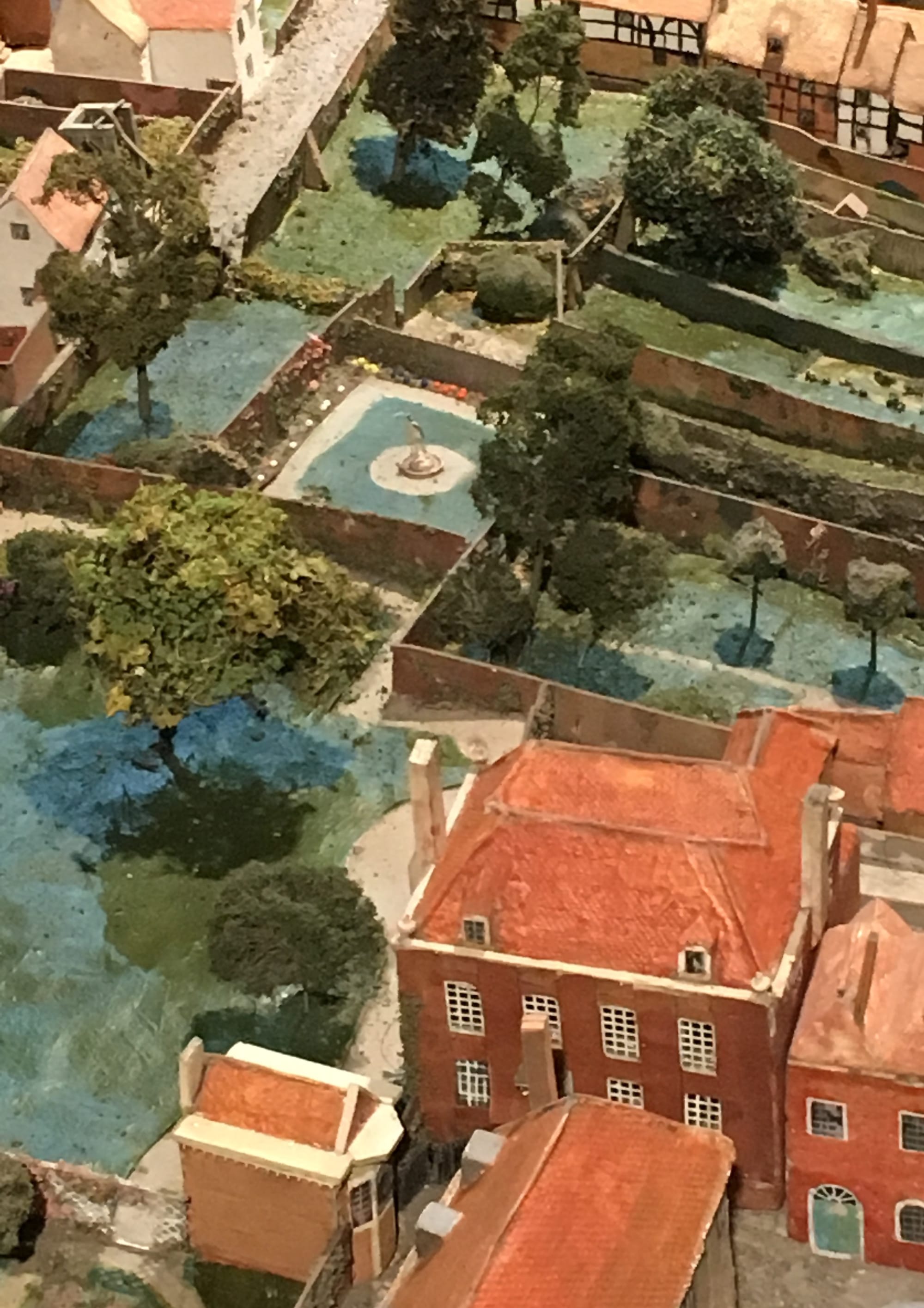 A scaffold platform was hired from Rye Hire, which allowed access to the centre of the model and the whole model was carefully cleared of accumulated dust using dry paintbrushes. Beautiful details previously lost started to remerge - pathways in the churchyard, flowerbeds with bright coloured beads to represent blooms, washing lines with multi-coloured laundry and even a statue in Lamb House garden.