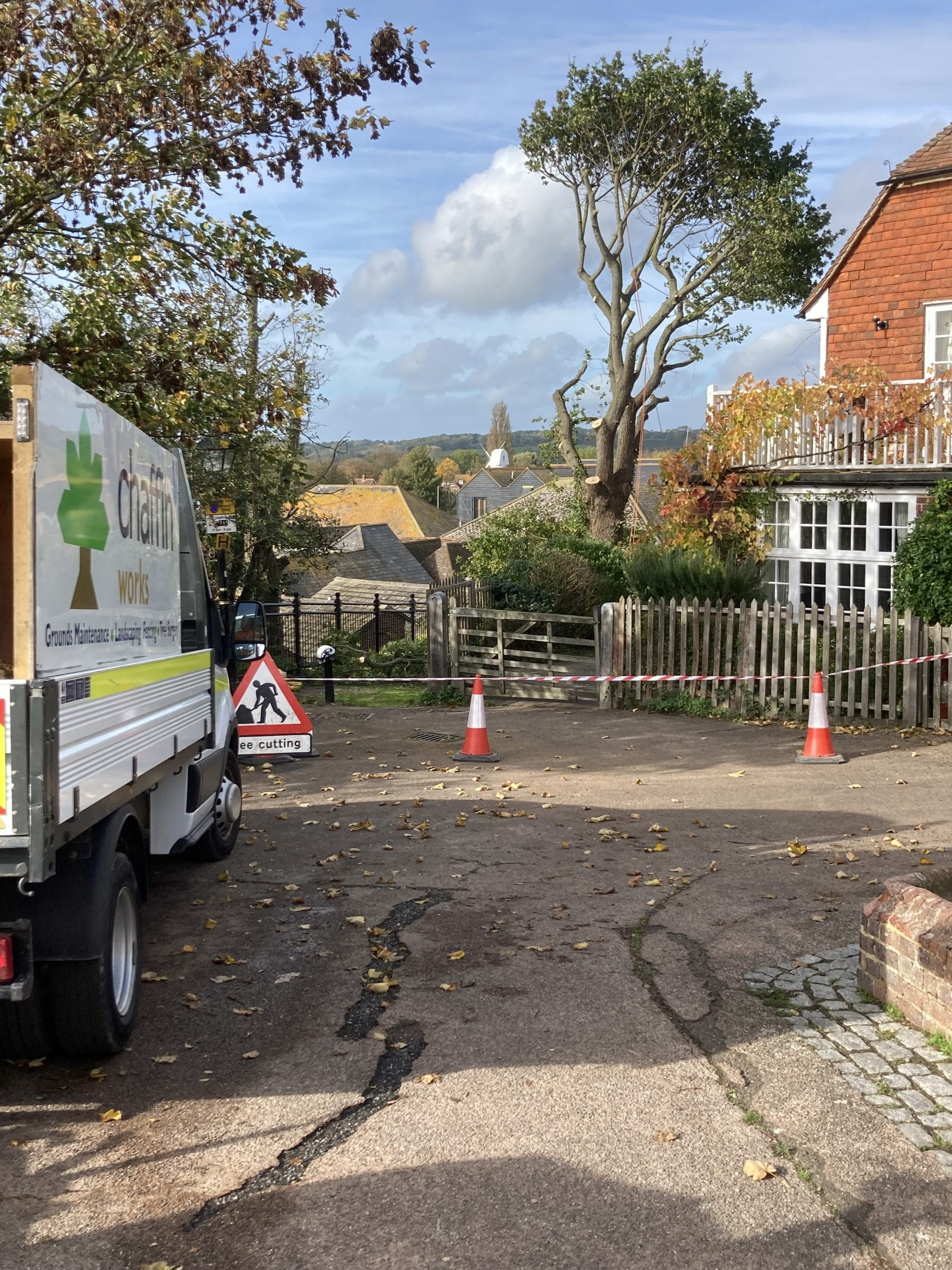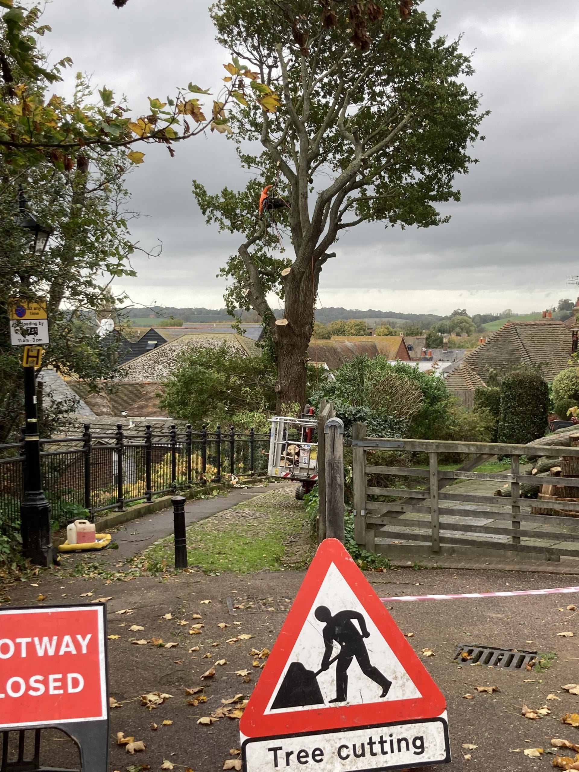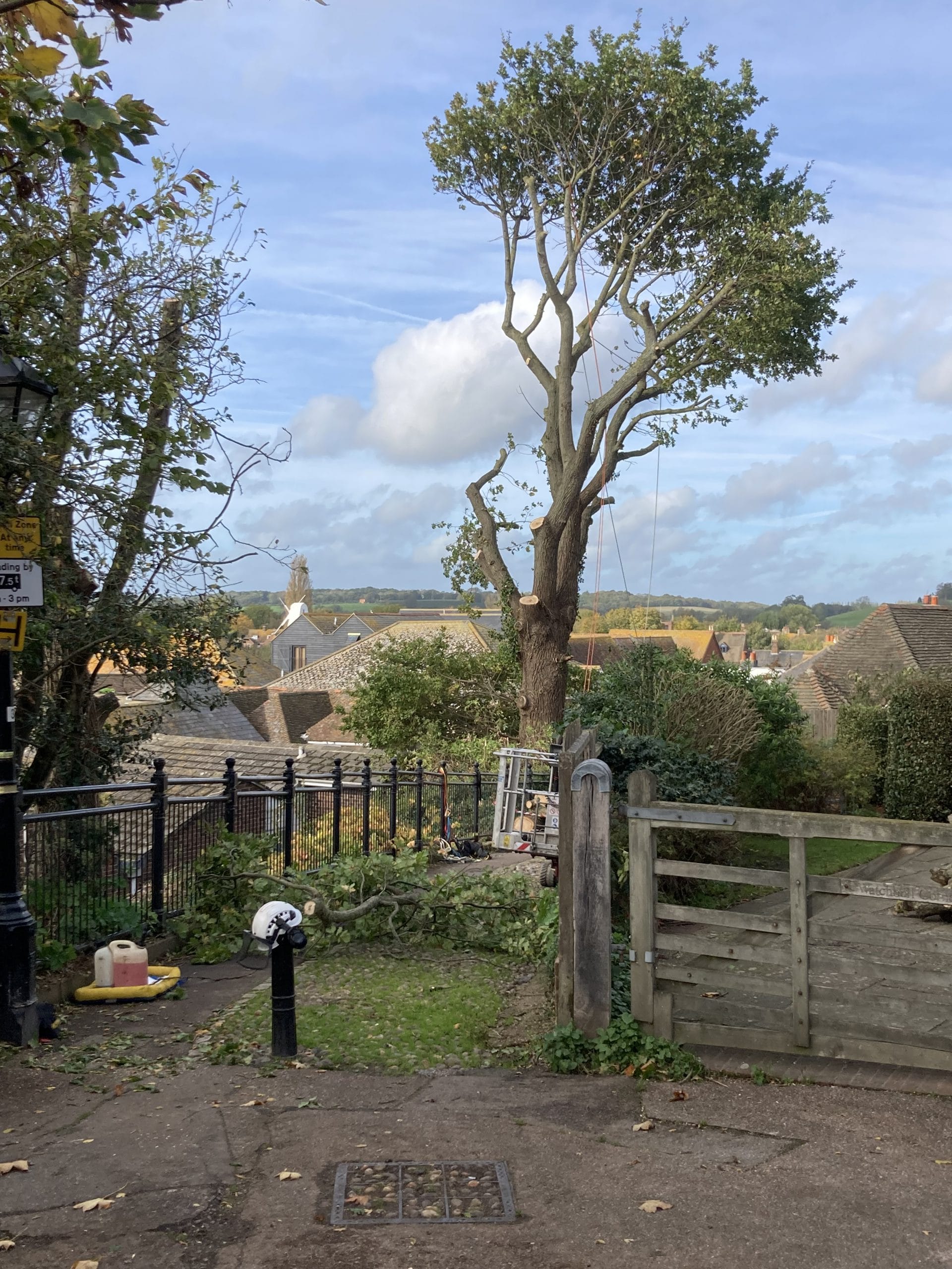 After the first oak nearest The Hope Anchor was roughly cut back, the tree fellers found fledglings in the other oak tree, so a long rain check ensued.