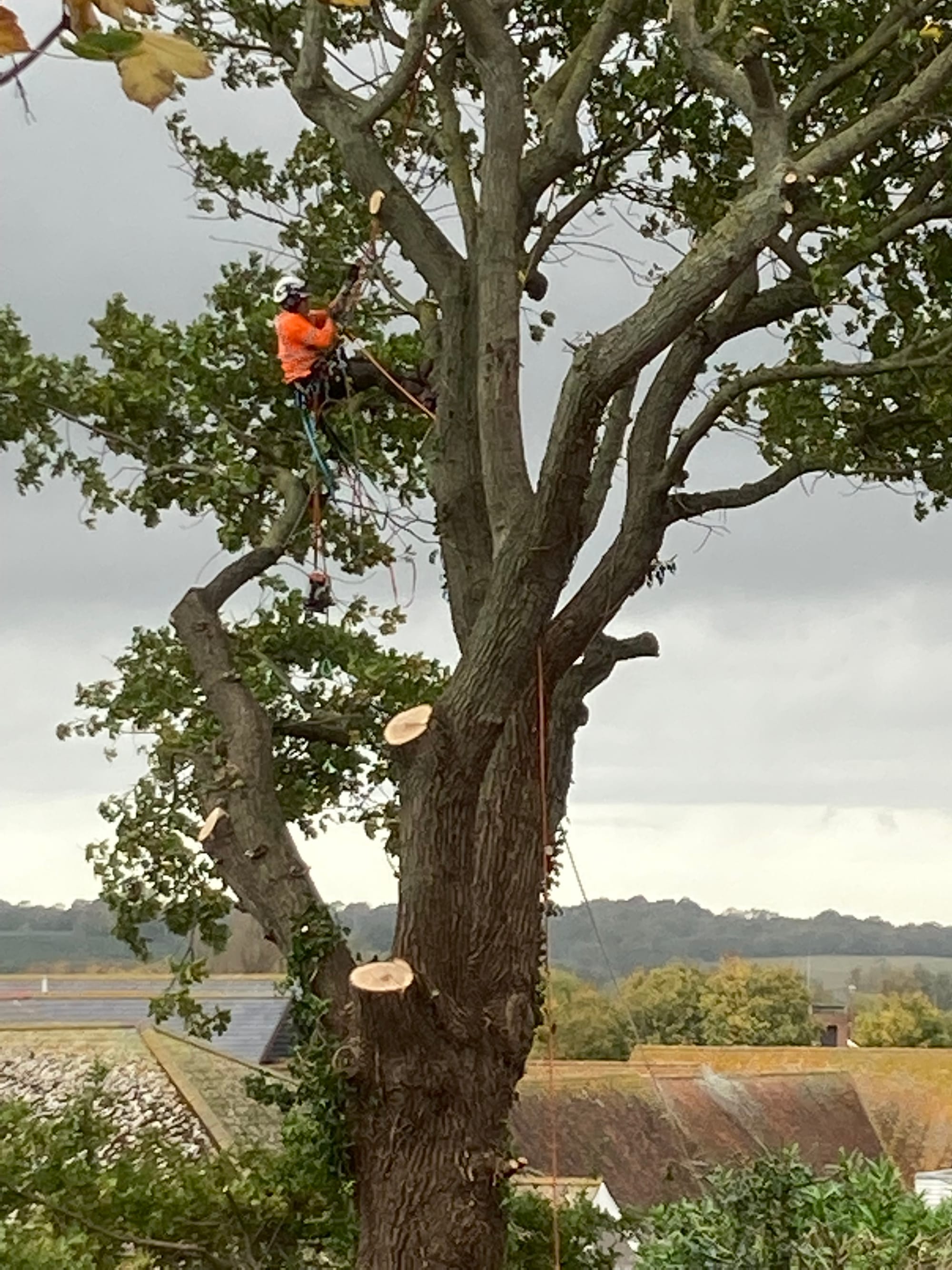 Now as you can see from further photos, the second oak has been half cut back. I gather from the men doing the work that it has been decided to leave them both semi-pollarded. No reason given, except that I think when you completely kill a mature tree you can get trouble with land heave when the root system dries out and obviously shrinks. So possibly not a bad compromise.