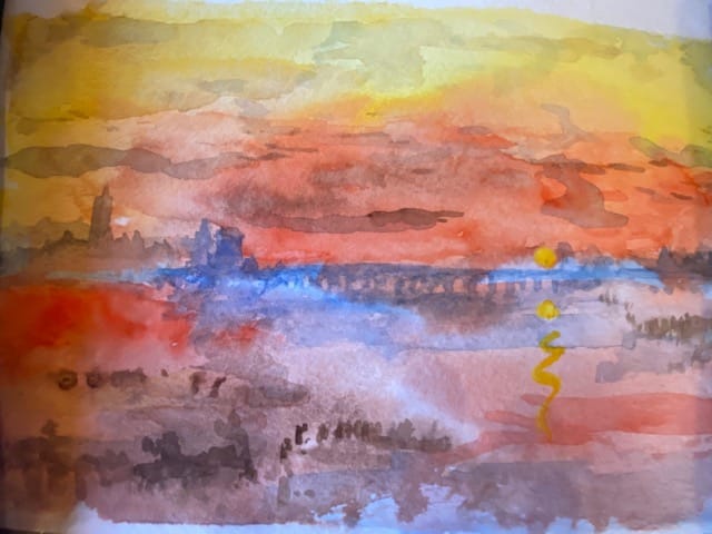 FELICITY PIKE’s Untitled watercolour of a sunset/sunrise over water.