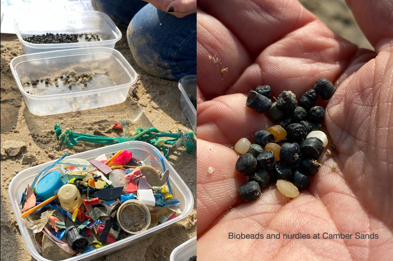 Seeing the large amounts of litter and fishing debris on the beach at Camber over the years caused me increasing distress. I felt helpless in the face of the never ending tide of litter on the beach, spending many hours dragging bags of discarded bottles and plastic off the sand. In an effort to do something positive I joined Strandliners, who campaign for cleaner rivers and seas locally. This became a way to understand more about beach pollution, and to take part in plastic surveys on the shore alongside likeminded individuals. I learned how to distinguish different types of plastic pollution including nurdles from shipping spills, and biobeads from sewage overflows onto the shore, all of which are plentiful at Camber Sands.