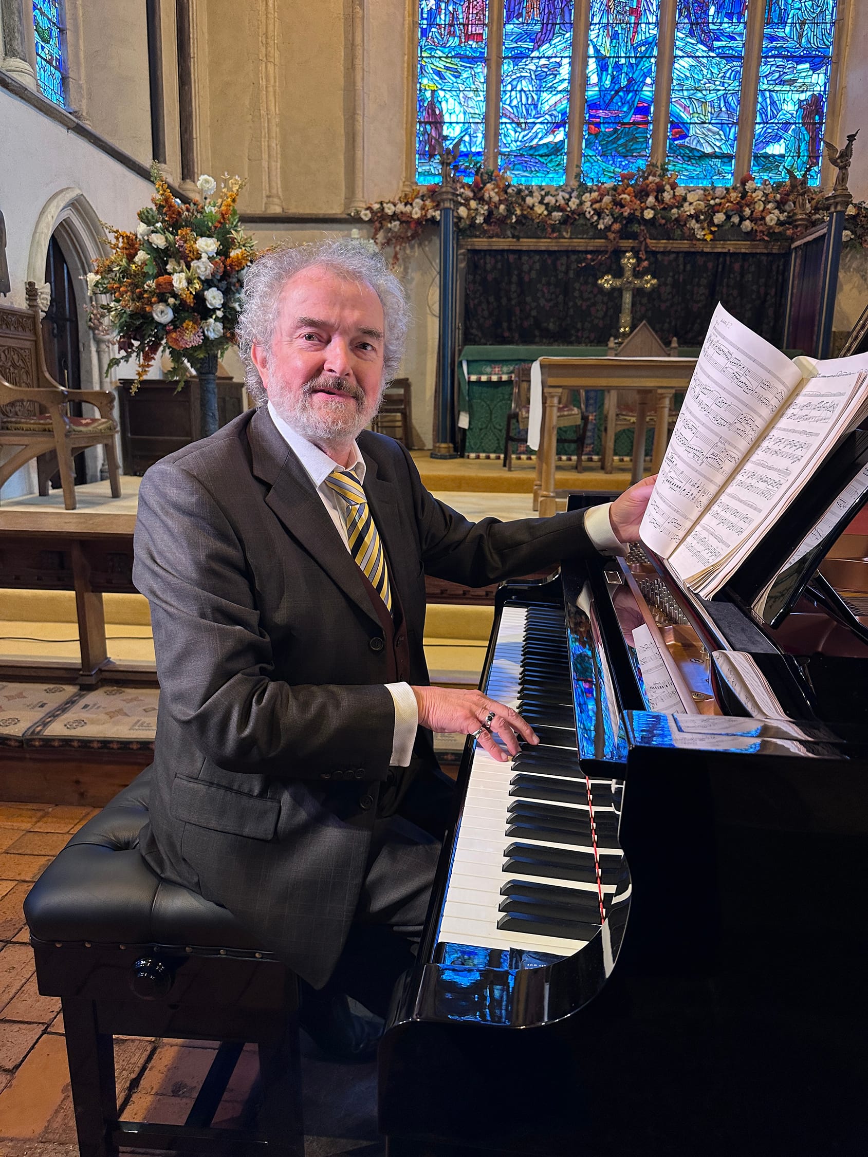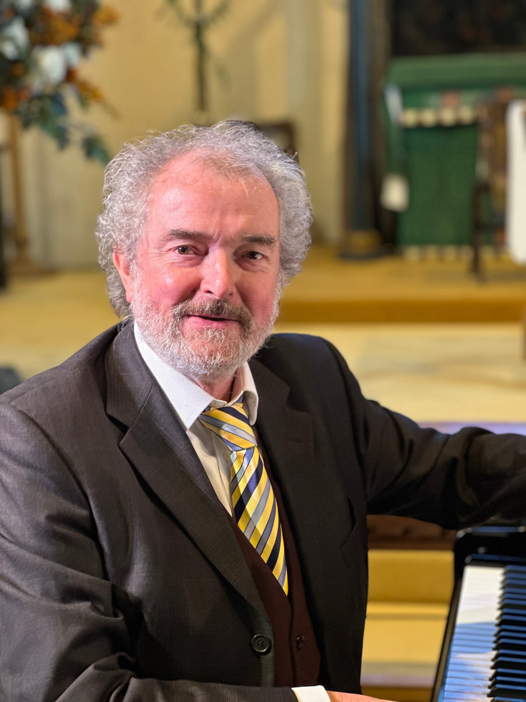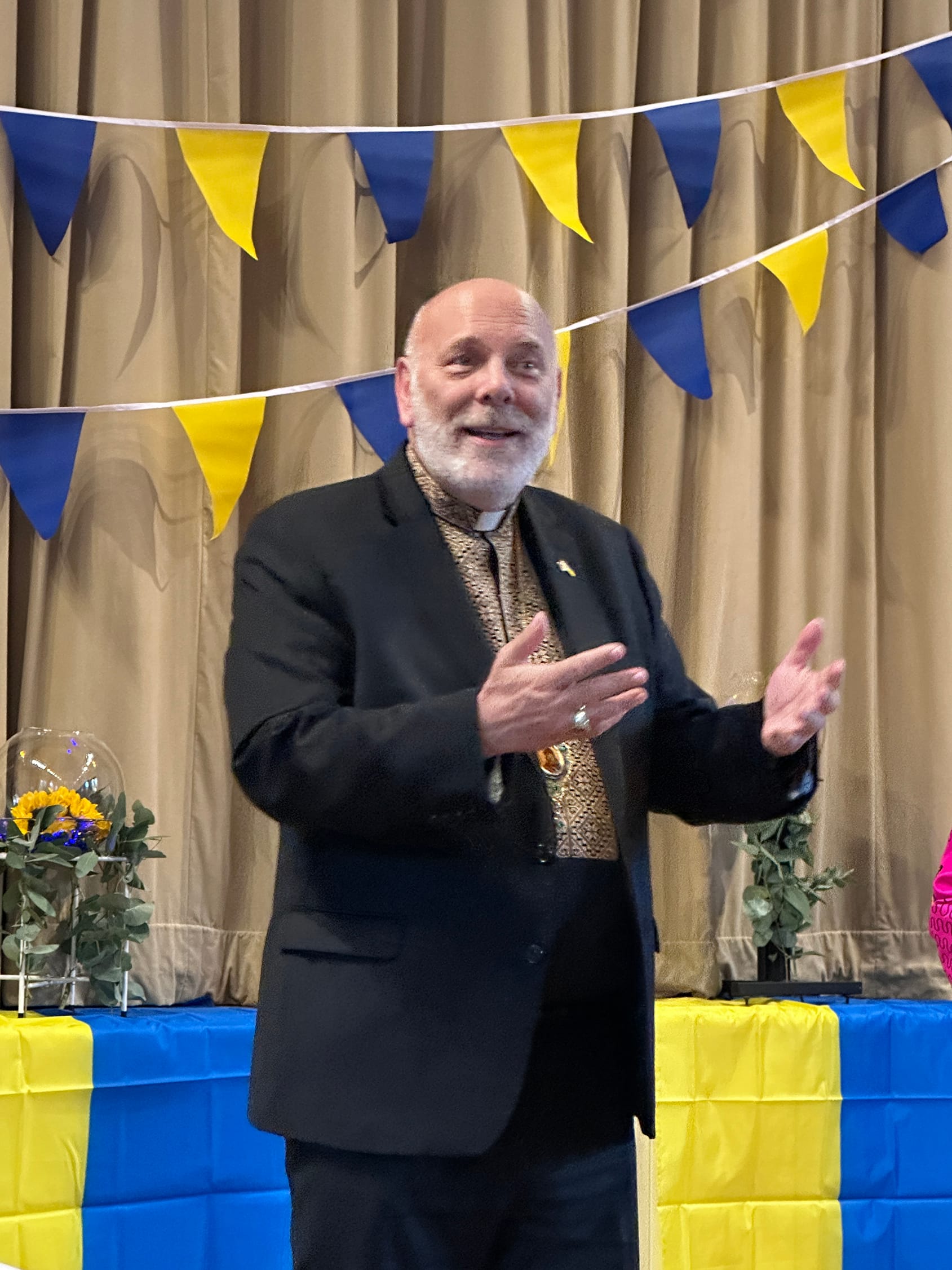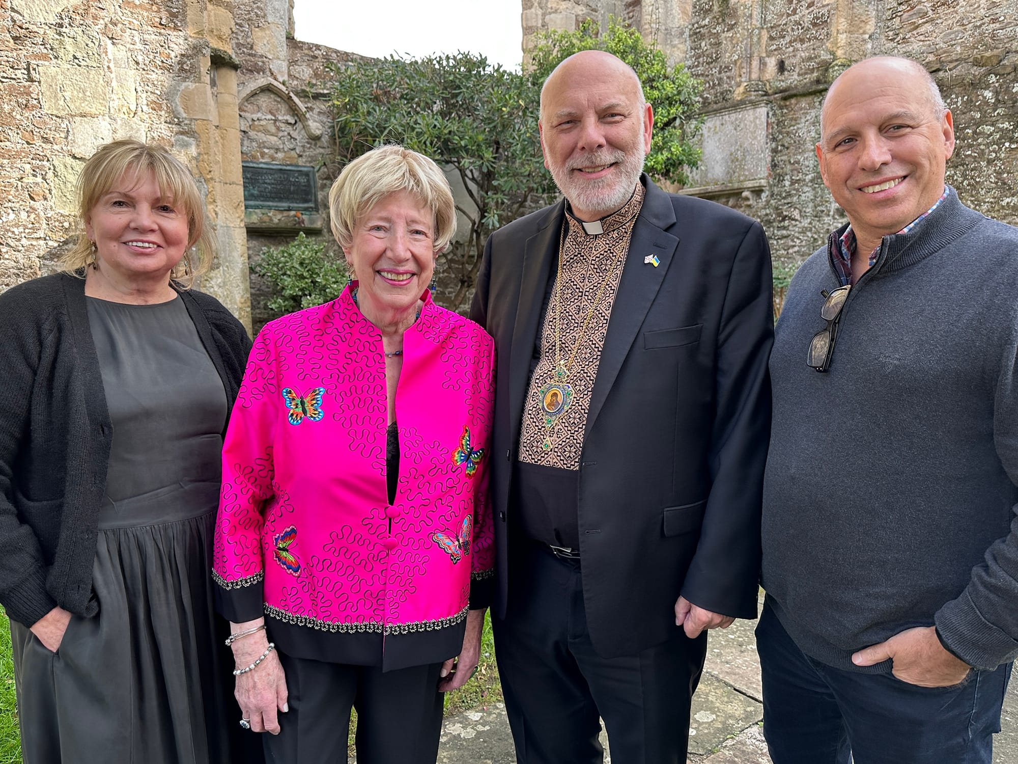 Seated in the audience was Bishop Kenneth Nowakowski, Eparchial Bishop of the Ukrainian Catholic Eparchy of the Holy Family of London, a charismatic figure, born in Canada to Ukrainian immigrants, who had just returned from his second visit to Ukraine. He spoke eloquently at the private after-concert reception in the New Hall which was tastefully decorated in Ukrainian colours with flags and flowers.