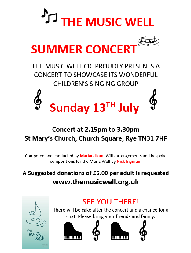 The Music Well Children's Singing Club are proud to invite everyone to join them at their wonderful summer concert on Sunday, July 13 at 2:15pm at St Mary's Church in Rye.
