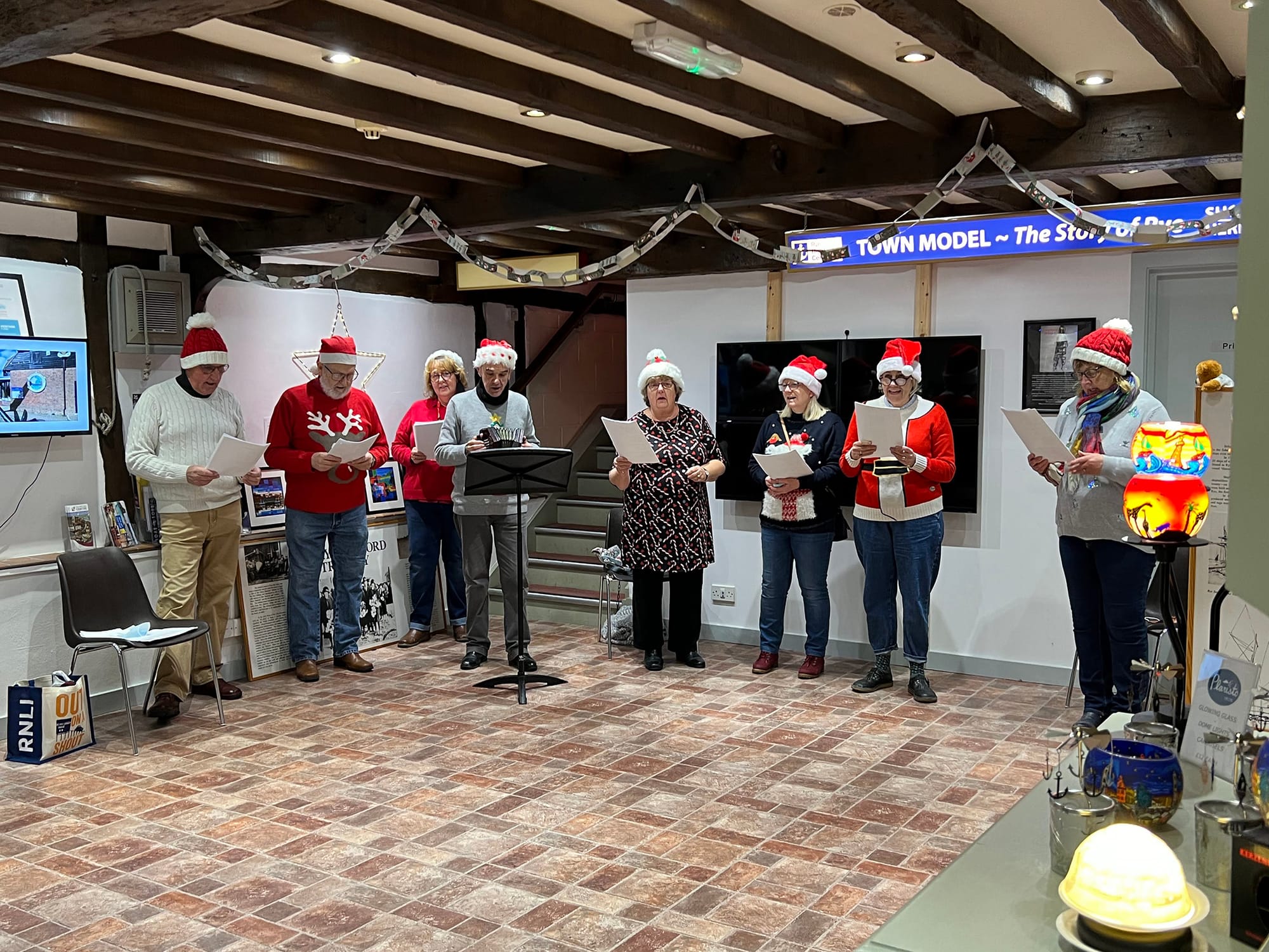 Round Rye Bay Singers, the shanty group brain-child of Martin Bruce, performed carols at the Heritage Centre to an appreciative audience of all ages. Paul Goring, the wonderful town crier of Rye, heralded the performance by his "Oyez! Oyez!" (the French word for listen) and welcomed people to gather round and enjoy the singing. Martin accompanied his group on the concertina. They ended the performance with their signature shanty Round Rye Bay for more and were rewarded by great applause and enjoyment.