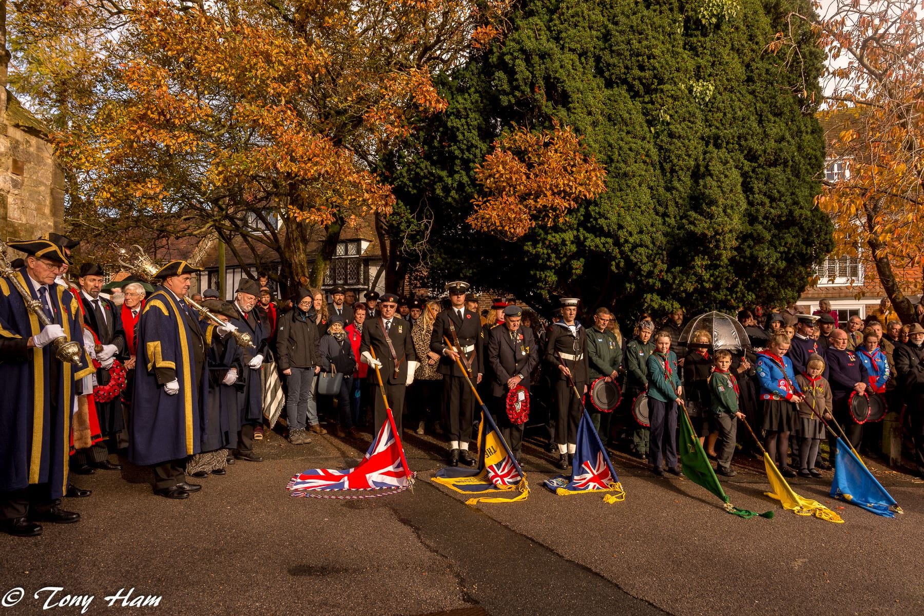 At 10:30am the traditional parade, organised by the Rye Branch of the Royal British Legion (RBL), left the High Street to march up East Street and then to St Mary's church. On the way they passed the Town Hall where the Mayor was waiting, with other members of the Town Council, to take the salute. Having done this, they too processed to the church, releasing several motorists (including one rather impatient one who found it necessary to sound his horn) who, perhaps unaware of this Rye tradition, had decided to choose this moment, of all moments, to drive past the Town Hall and who were finally allowed to proceed on their way.
