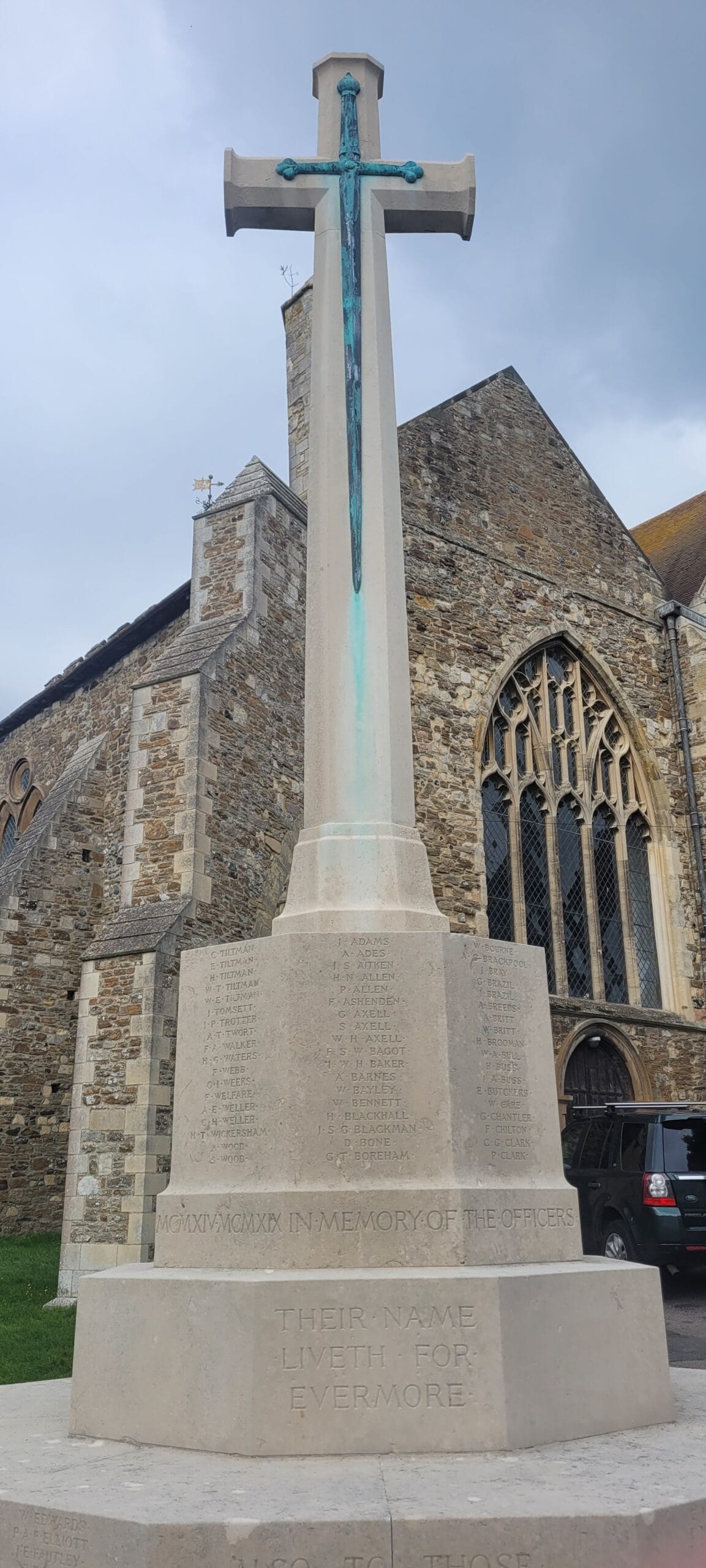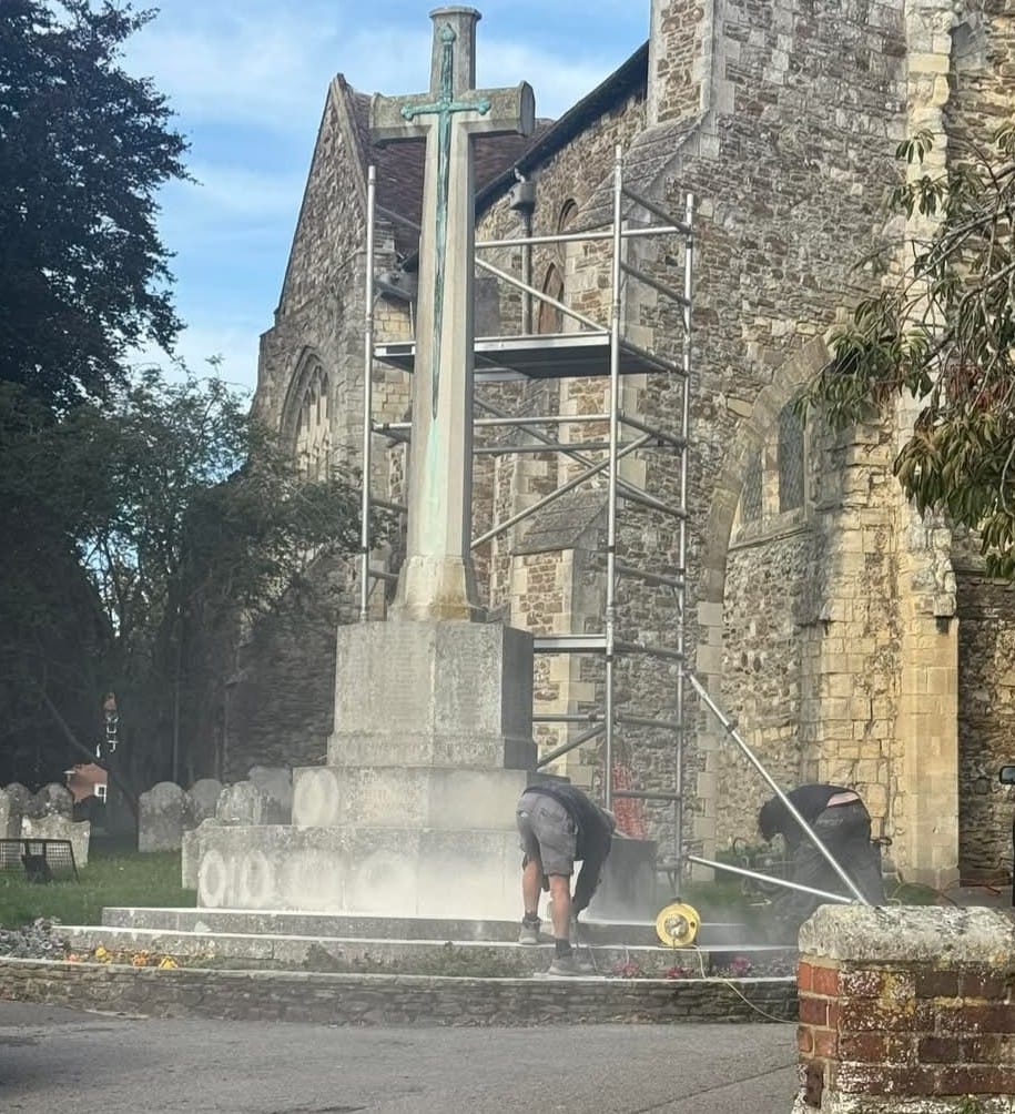 The work is being carried out by stonemason Elliot Brotherton of eB Sculpture who has worked previously on the memorial, the church and on the Camber Road memorial to early WW1 military flyers in the east of Rye. He used a specialist superheated steam system that draws out the staining while shielding the stone’s natural protective patina, and has been used to clean many memorials, including the Cenotaph.