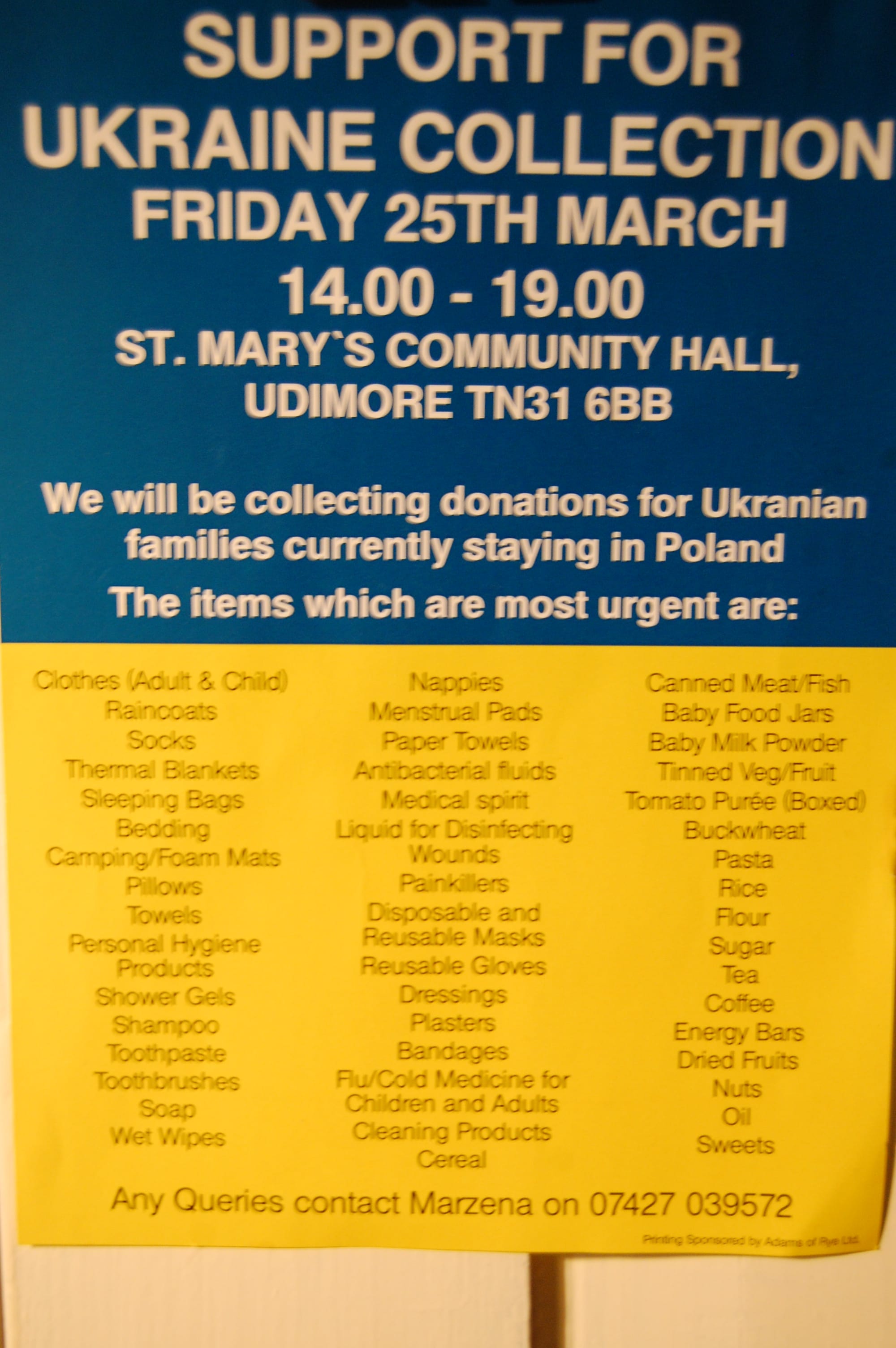 Alongside this are other initiatives for providing aid as mentioned elsewhere in Rye News. Also there will be a collection at St Mary's community hall, Udimore on Friday March 25 between 2pm and 7pm, for Ukrainian families staying in Poland. Useful products and care items of various kinds are urgently needed. For further information contact Marzena on 07427 039572.