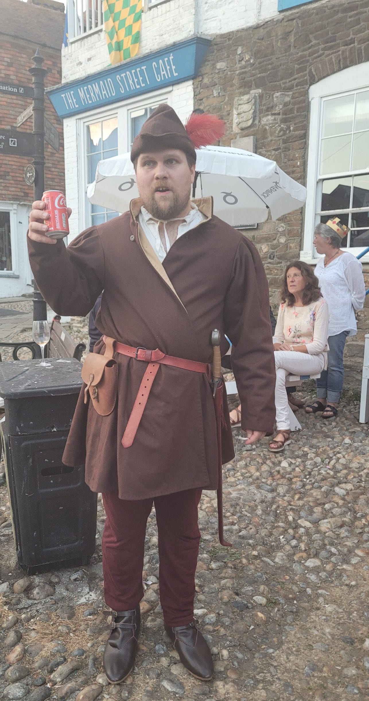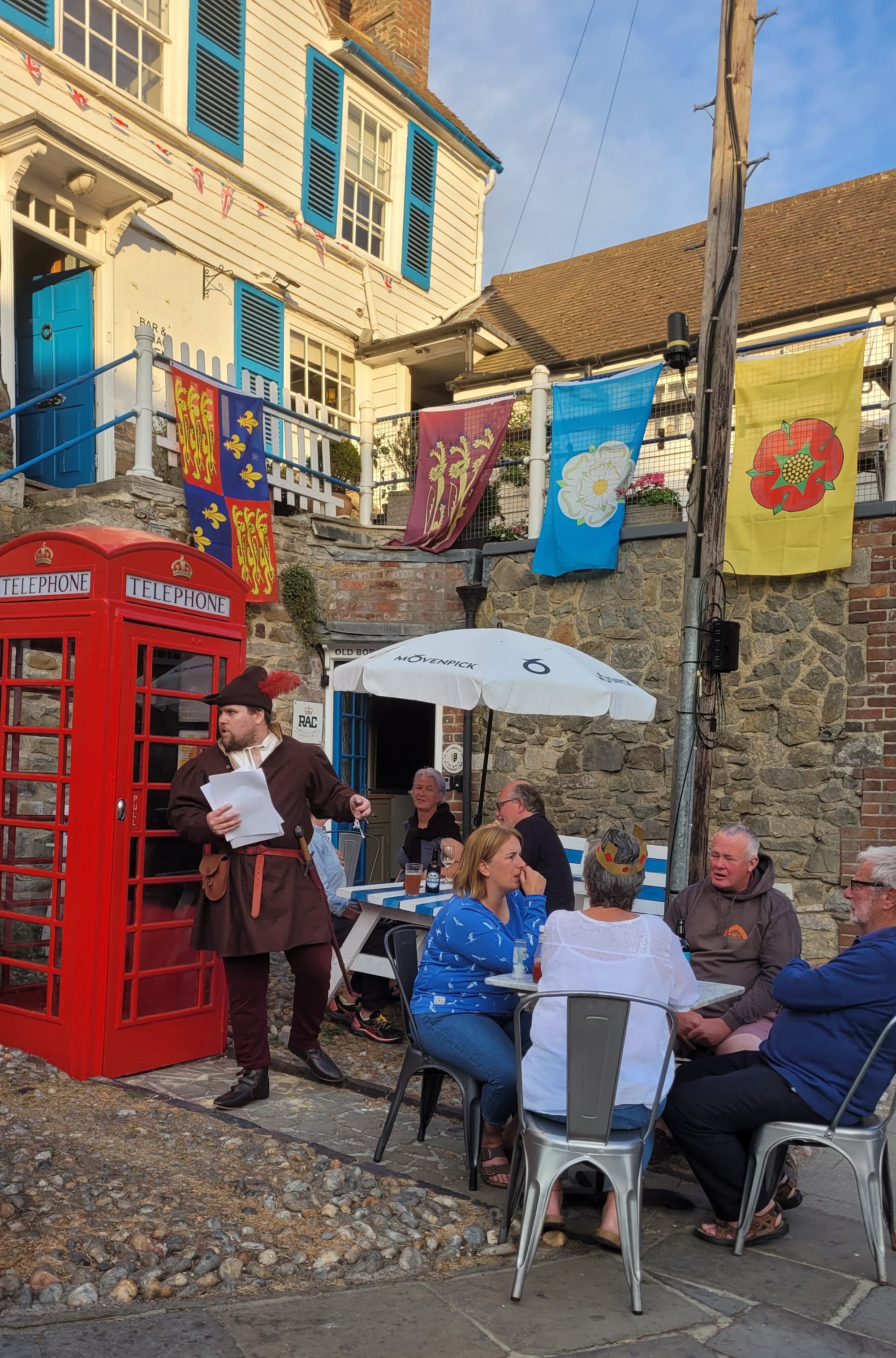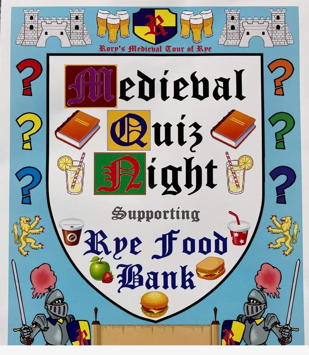 On a warm and sunny evening last week, a group of people gathered around the blue and white striped tables and benches outside the Old Borough Arms (colourfully bedecked in heraldic flags) for the medieval quiz organised by Sir Rory de Cross in aid of Rye Foodbank.