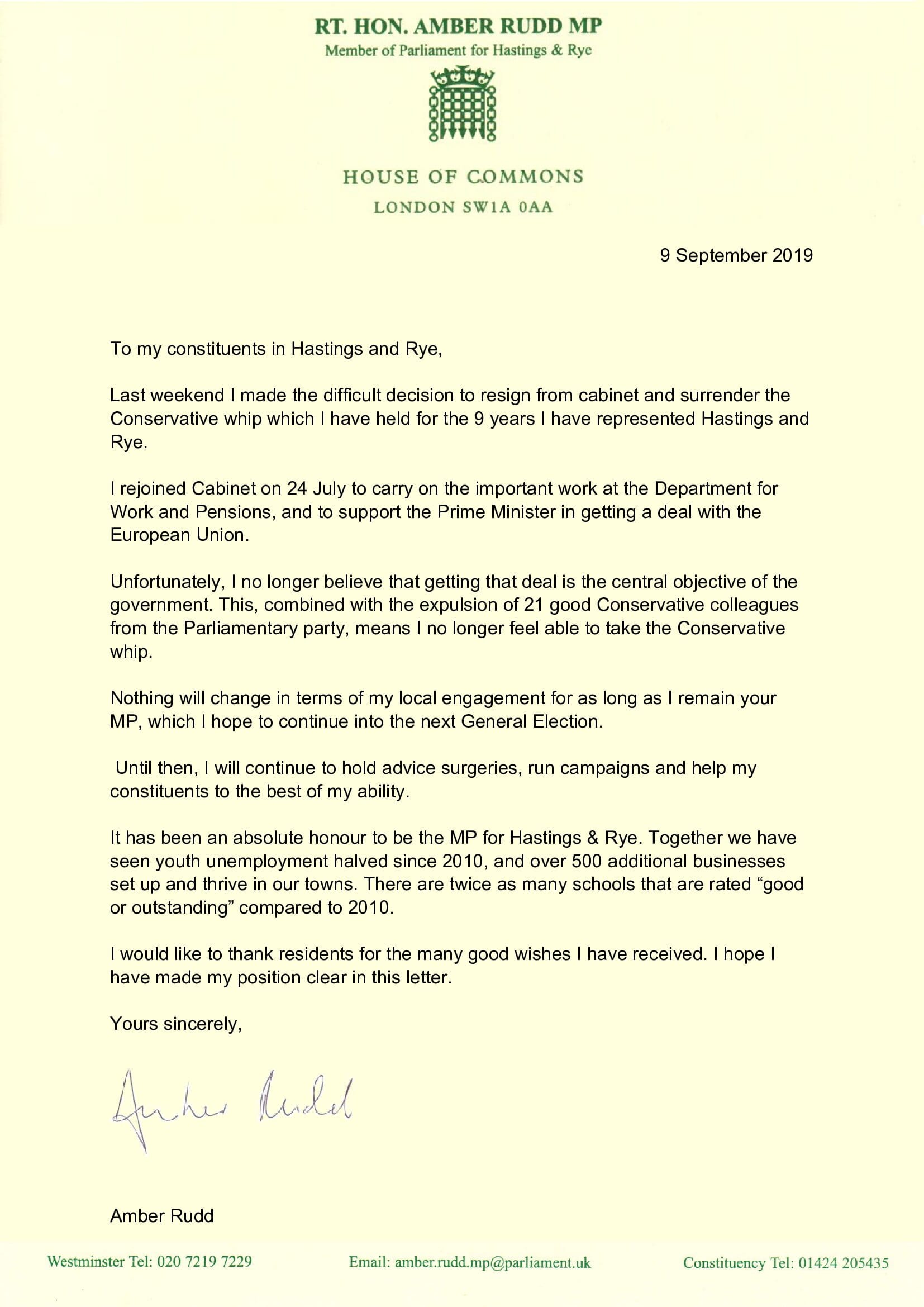 The local Conservative situation is unclear. Amber Rudd is, at the moment an independent Conservative and she has stated (see letter above) that she will continue to serve the constituency until an election . Her view on Brexit was to acknowledge the referendum result and leave with a deal, if possible. She does not wish to divide the Conservative vote at the next election and has confirmed that she will not be contesting the seat. Rye News has asked the Hastings and Rye Conservative Association about the selection of a new candidate, but so far there has been no comment