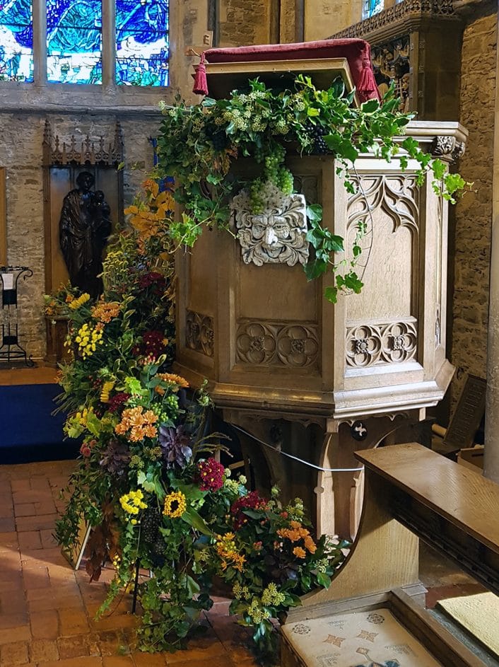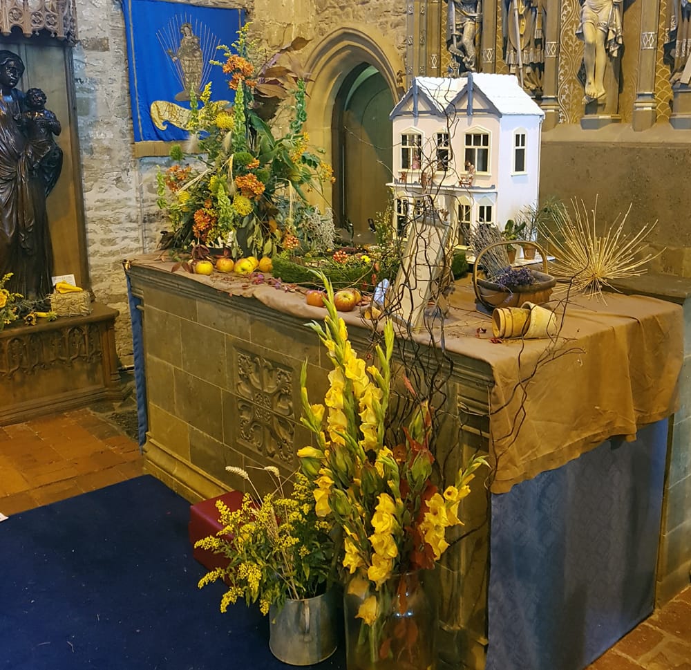 A doll’s house featured with its own garden as earth, some beautiful sanctuary arrangements celebrated harvest and the primary school excelled with its wonderful contribution of flowers in children's wellie boots.