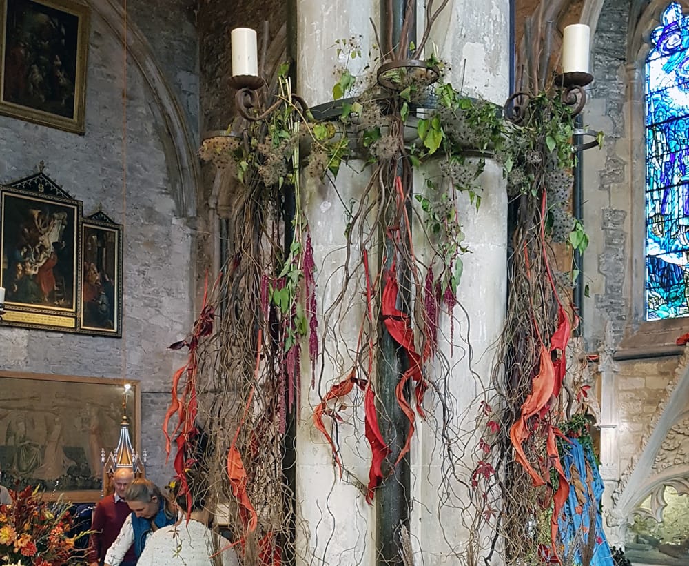 The flowers were truly spectacular, the theme being Harvest and the Elements, with four very different interpretations of pillars of fire, three "water" features, an ingenious display of air plants, seed heads and hanging flowers disguising the scaffolding supporting the organ.