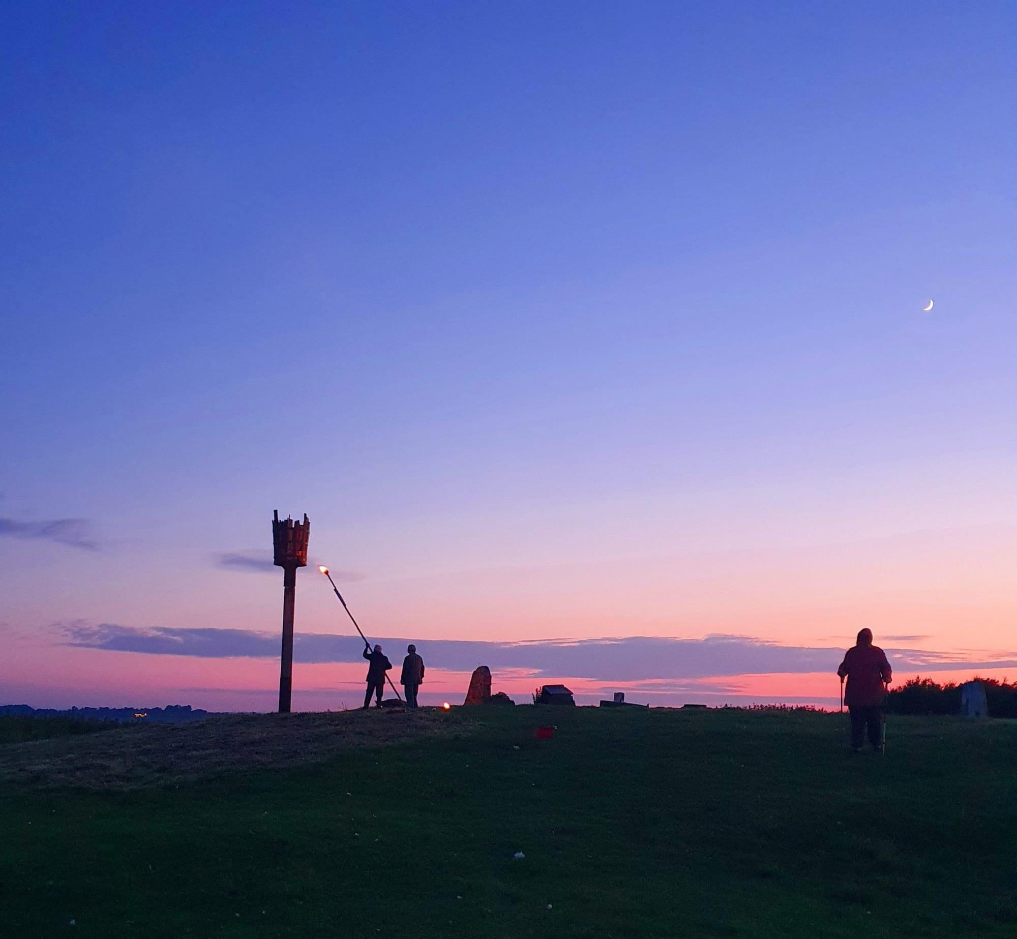 After a reception in the flag-decked New Hall, everyone followed flaming torches across the fields to the newly refurbished beacon, led by bagpiper, Roddy Livingstone.