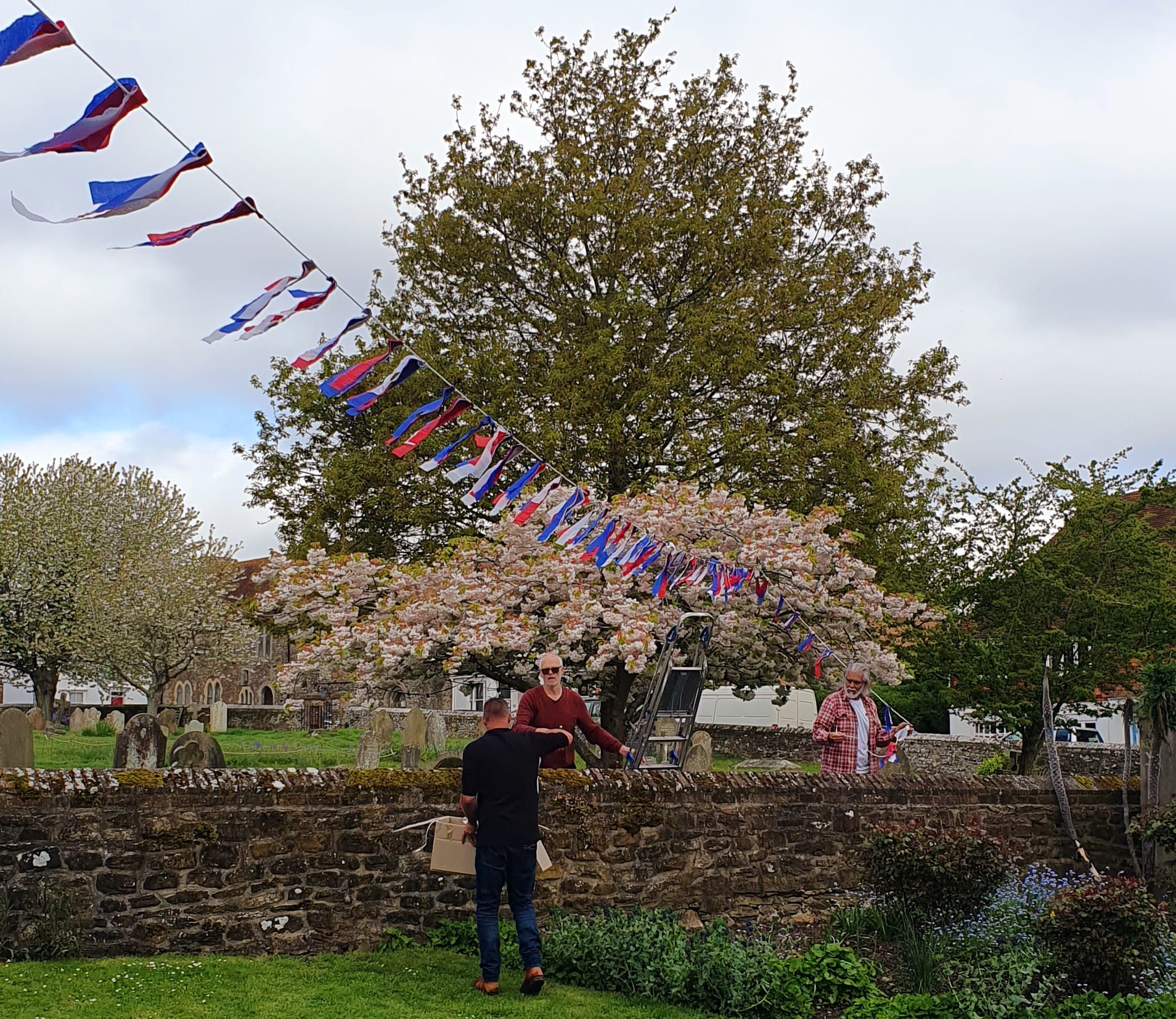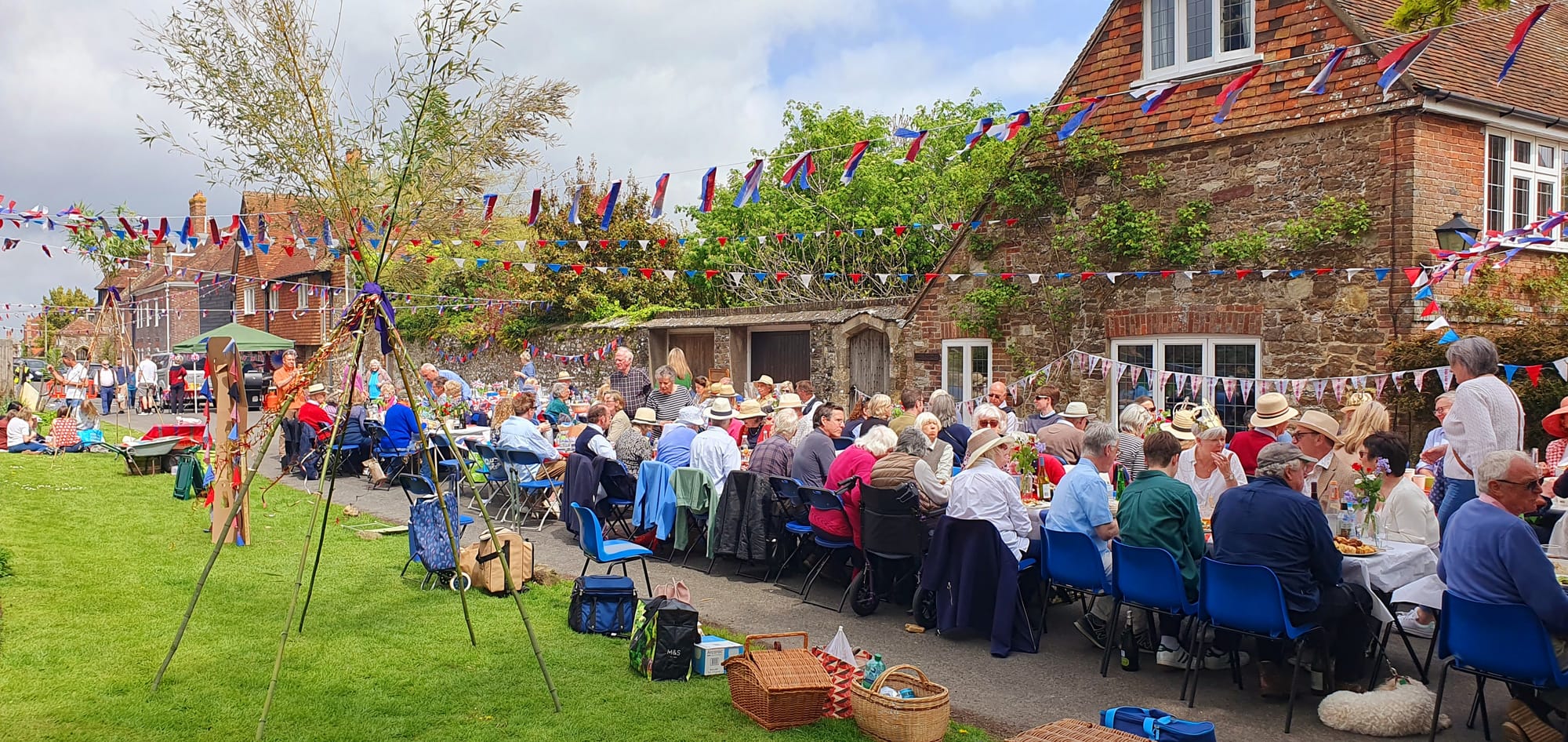 And so on Sunday, May 7, we held a huge street party, to mark the coronation of His Majesty King Charles III. We started with 120; this was dictated pretty much by the number of tables and chairs available from the New Hall. And then it went up, so we requisitioned tables and chairs from St Thomas'. And then it went up, so we raided the Court Hall. We finished at around 225, plus picnickers on the verge.