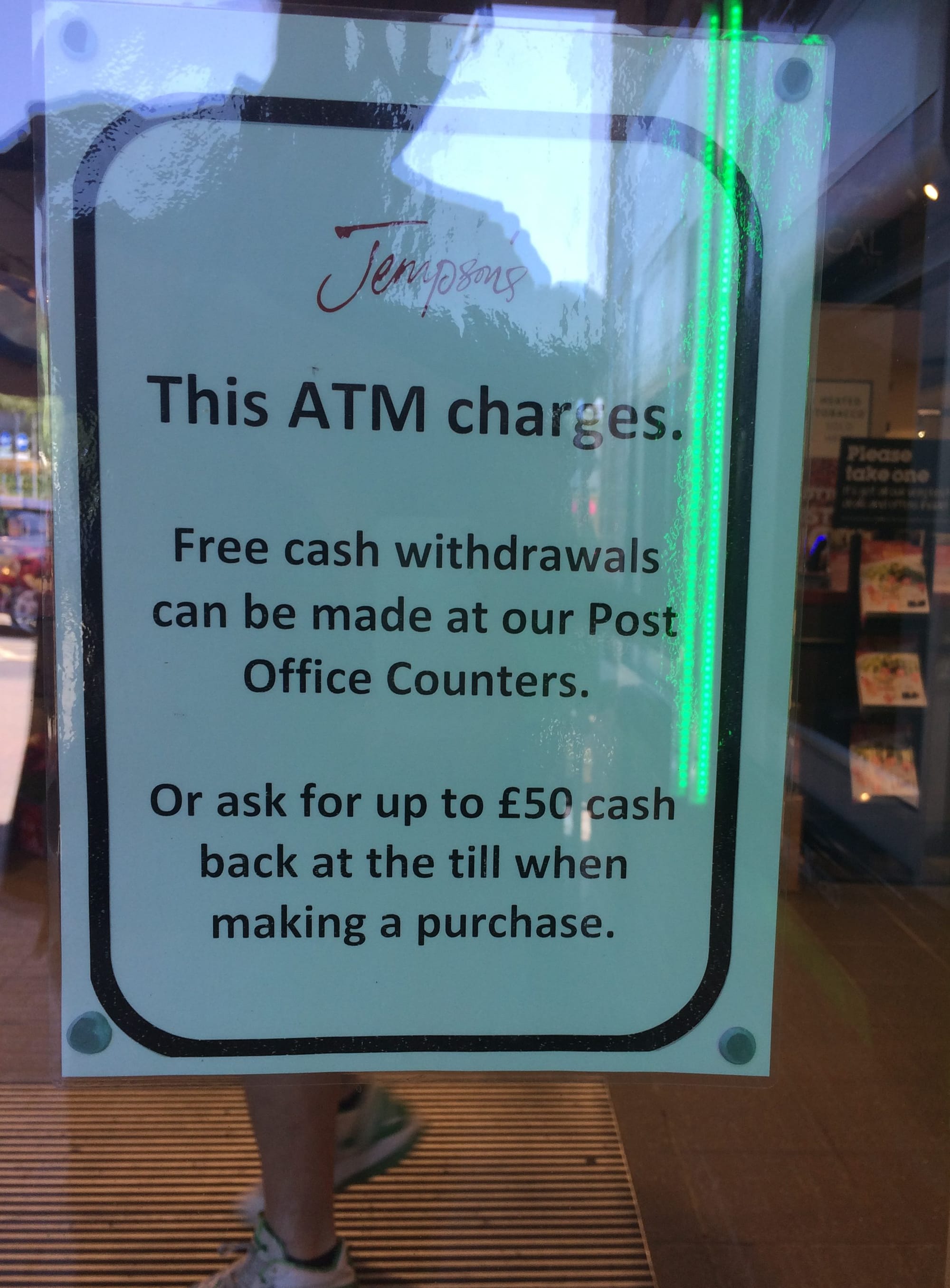 A small, and fairly inconspicuous, notice on a window close to the machines gives warning that if a customer actually wants their own money from their bank, they will have to pay for it to the tune of 95p for each withdrawal.