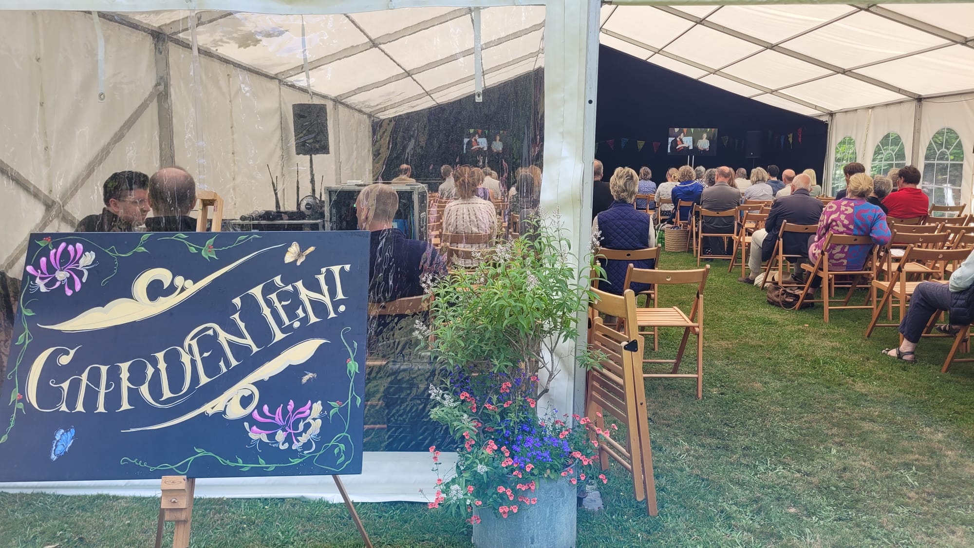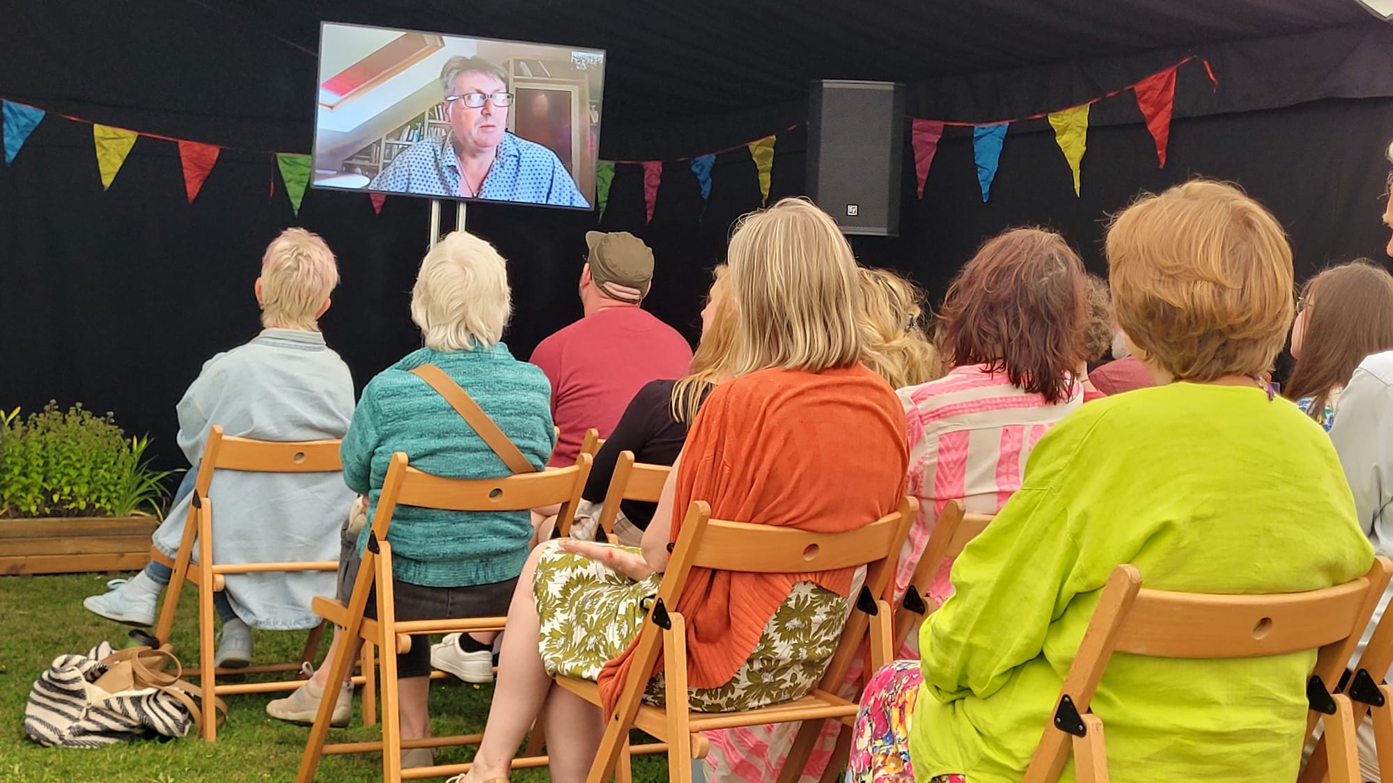 The highlight of the weekend was Simon Armitage, the poet laureate, reading poems from his extensive body of work. Unfortunately, he was unable to appear in person due to the train strike but even via zoom (and unable to hear the audience applause) he held us spellbound through his readings with his witty and dry humour. Referring to the tent, with its folding chairs, flowers and colourful bunting he said, “You look like you are at a wedding – one without a groom” and “It looks like a garden centre there… Don’t forget to pay for your tomatoes on the way out.”