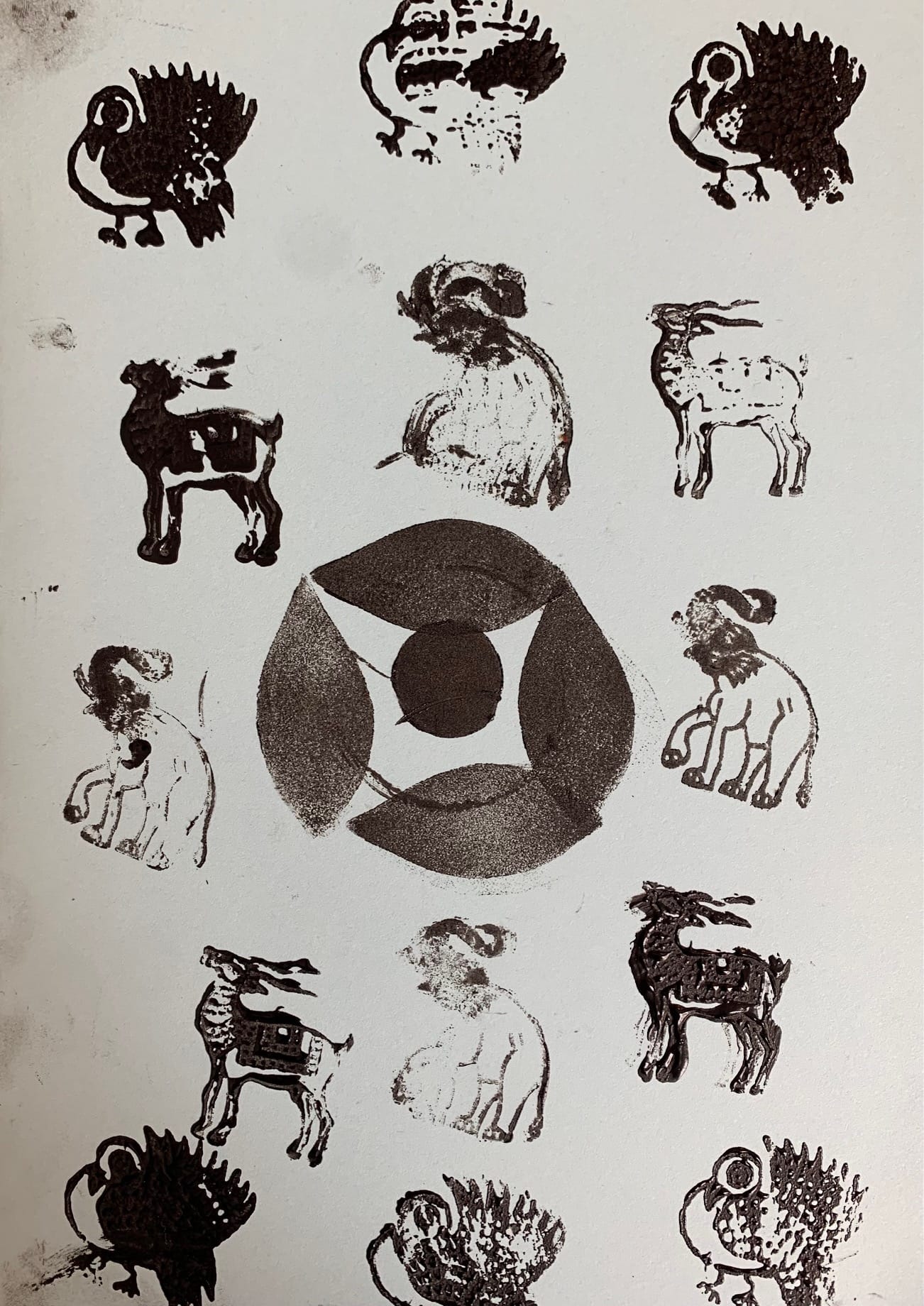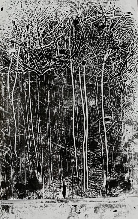 A monoprint can be made in two ways. An image is made from a smooth surface or plate which is coated in printing ink and a design drawn directly on the inked surface. Paper is then laid on the ink to pick up the design. Alternatively paper is placed on the inked surface and drawn on so transferring the ink onto the paper to create the image.