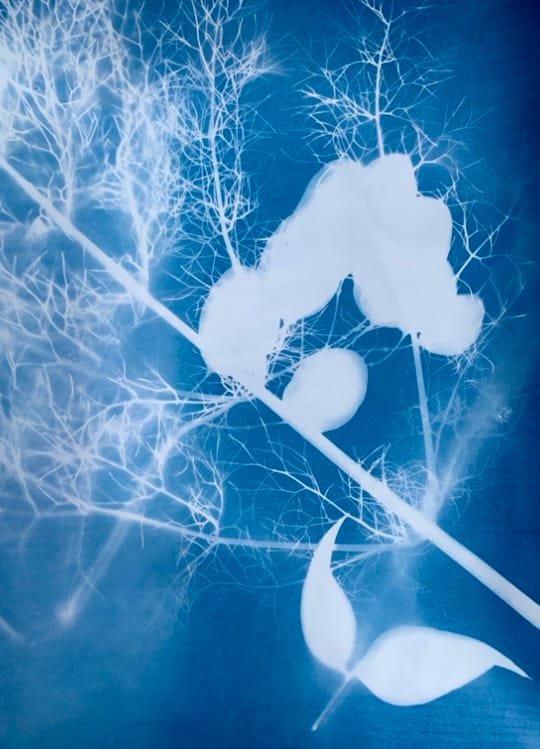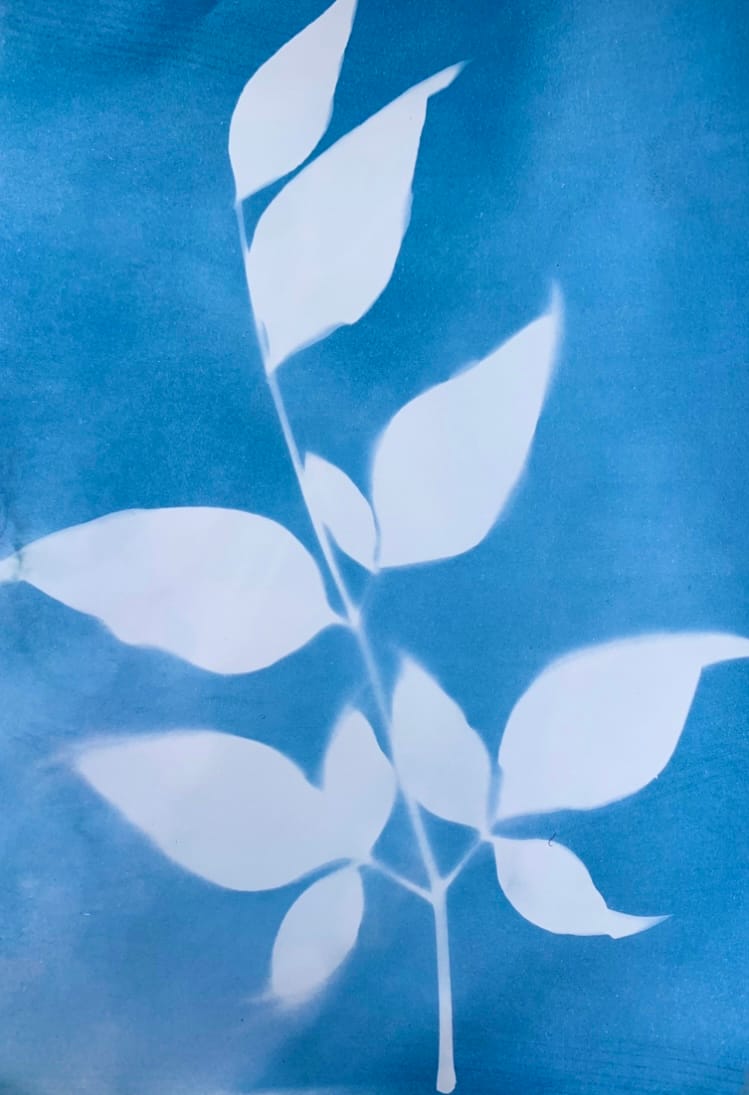 Cyanotype prints are made on paper or fabric that have been coated in a light sensitive emulsion. Stencils, leaves, feathers, photographic negatives or other objects are put on the surface to block the light and the paper is then exposed to sunlight. Once exposed, the solution is washed off the paper to fix the image. The exposed areas turn blue and the parts covered by the objects stay white.